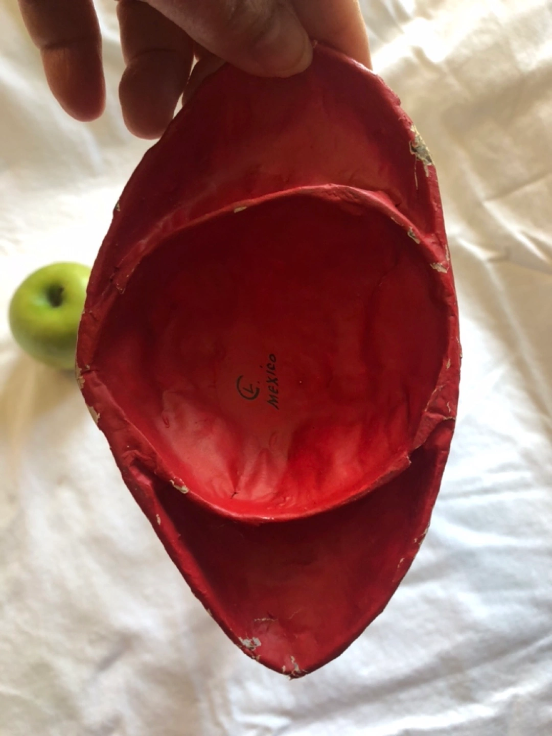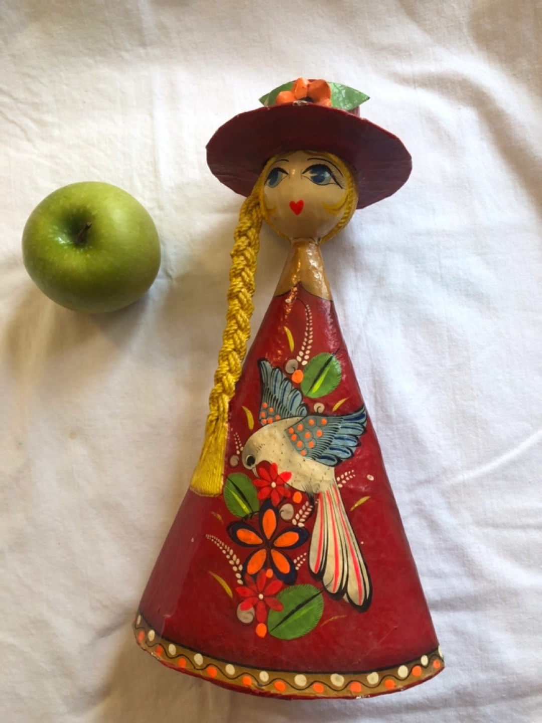 Hand-painted folk art decorative doll. Red dress, yellow braid, and floral accents. Made in Mexico. Unique collectible. Apple for size comparison-not included! Note small flaw to hat.