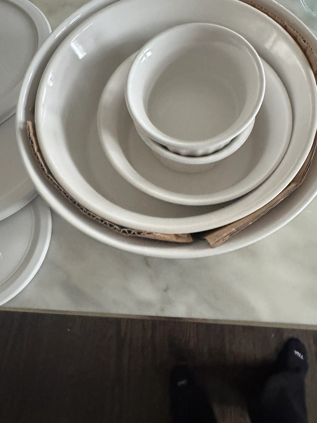 Nine-piece baking dish set. Includes two large casseroles with lids, two small ramekins, and three additional lids. Great for baking, serving, and storing. White ceramic with fluted sides.