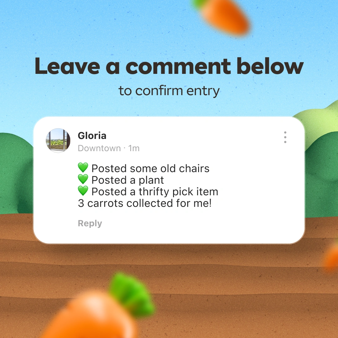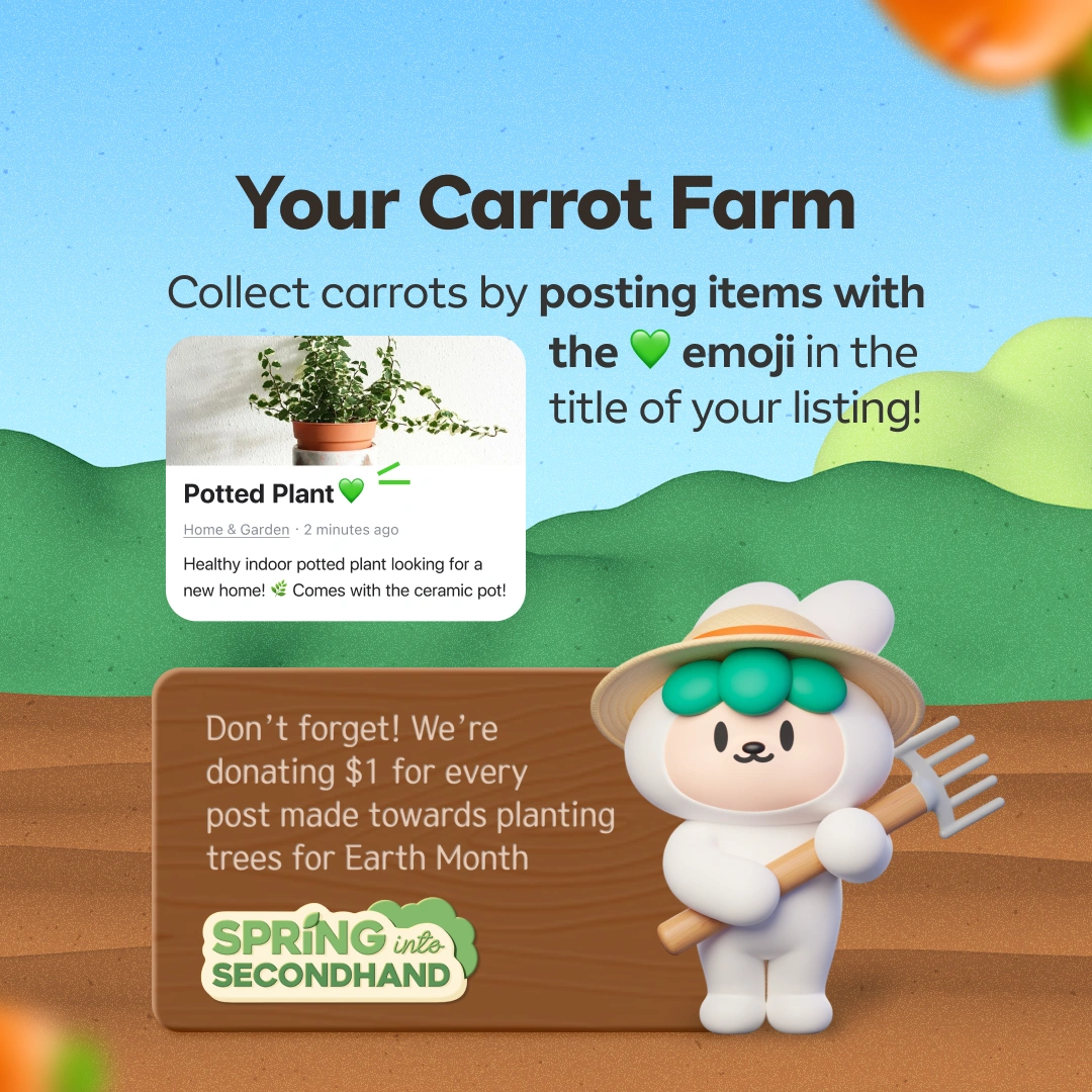 1000+Hey Karroters, Spring is in the air — and it’s the perfect time to clear out the clutter and freshen up your space! Join us in this week's “Collect the Carrots” challenge and let's add some fun into your spring cleaning ✨. From April 3-9 you can collect carrots by posting items for a chance to win a prize! Prizes: 🥕Collect 5 carrots - $100 Amazon gift card for 10 winners 🥕Collect 3+ carrots - $50 Amazon gift card for 10 winners 🥕Collect 1+ carrots - $10 Amazon gift card for 10 winners Collect carrots by posting items with the 💚 emoji in the title of your listing Post a free item 🥕 +1 carrot Post an item in Home/Garden 🥕 +1 carrot Post an item in Furniture 🥕 +1 carrot Post an item in Electronics 🥕 +1 carrot Post a Thrifty Pick item (priced below the AI suggested minimum price) 🥕 +1 carrot *Don’t forget! We’re also donating $1 for every post made towards planting trees for Earth Month* See post here: https://ca.karrotmarket.com/buy-sell/4761086 🌳 Here’s how it works: 1. Post items between April 3-9 with the 💚 emoji in the title of your listing 2. You may only complete each category only once (eg. posting 5 furniture items does not equal 5 carrots) 3. Leave a comment below to confirm your entry. Prize winners will be randomly chosen and announced on April 10th. Best of luck to all participants and let’s start collecting 💚. Terms and Conditions - Only posting made between April 3 0:00 - April 9 23:59 will be counted as valid entries. - Users can only complete each task once. Completing the same posting category multiple times will not result in more carrot points. - This promotion is only open to signed up & verified users. - Winners will be chosen randomly & announced as an in-app post on April 10th.