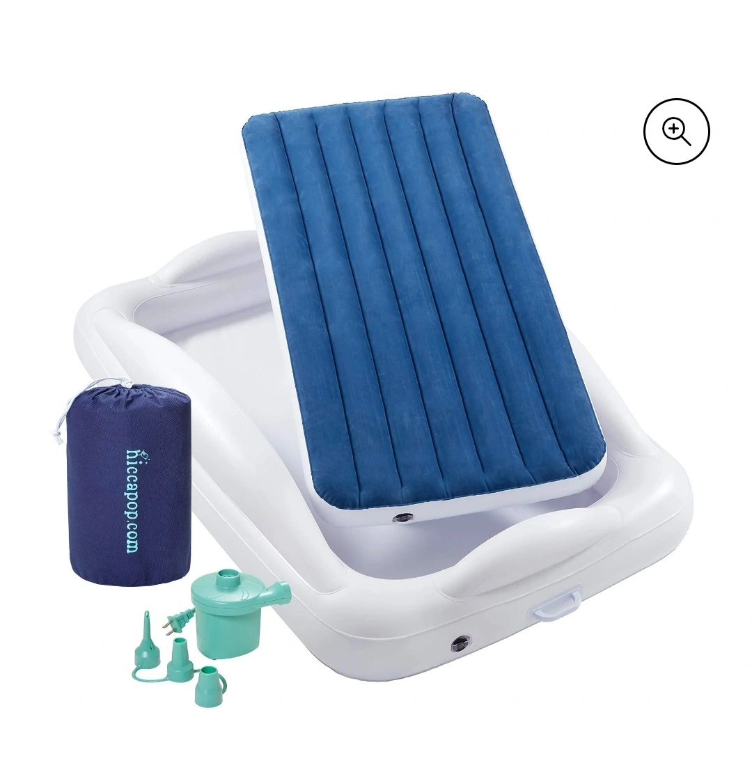 Portable inflatable toddler bed. Includes inflatable mattress, bed, pump, and storage bag. Easy to inflate and deflate. Perfect for travel or sleepovers.