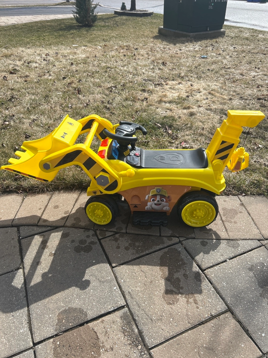 Yellow plastic ride-on toy. Features a working scoop and crane. Suitable for young children. Shows some minor wear. Comes with charger!