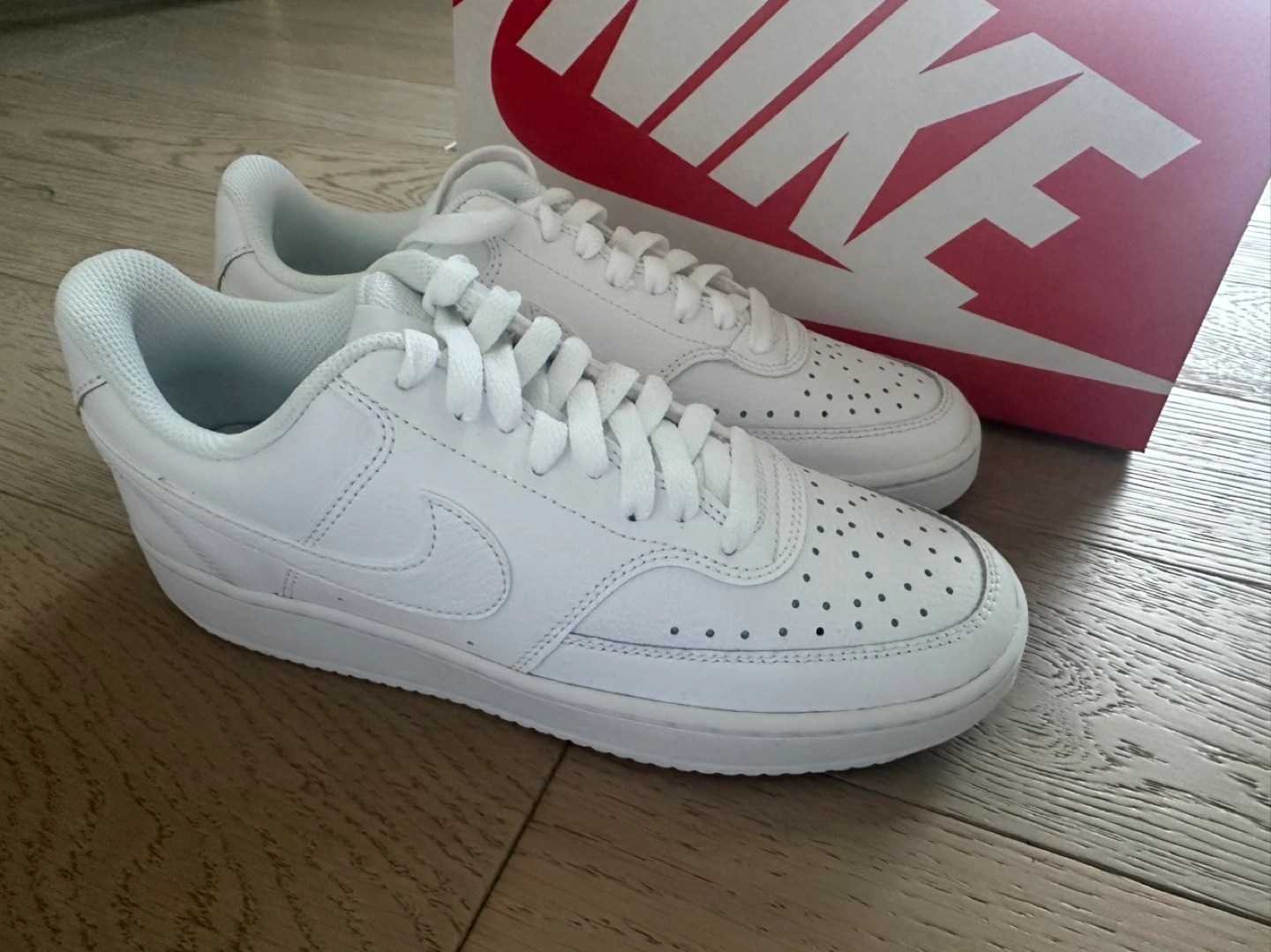 Women's Nike Court Vision Low sneakers. White leather upper. Perforated detailing. Size 8. New in box.