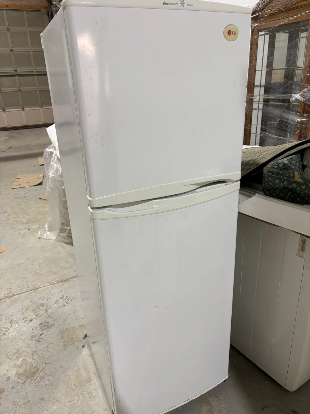 White LG top freezer refrigerator. Used, good condition. Features adjustable shelves and crisper drawers. Clean and ready to use.