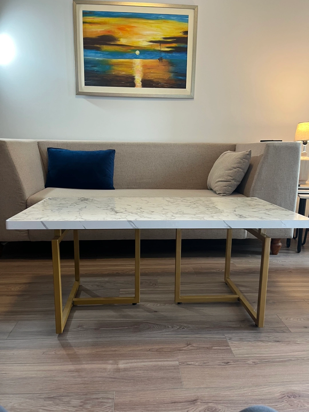 Stylish coffee table. Features a white marble-look top and gold metal legs. Perfect for a living room. Minimalist design.