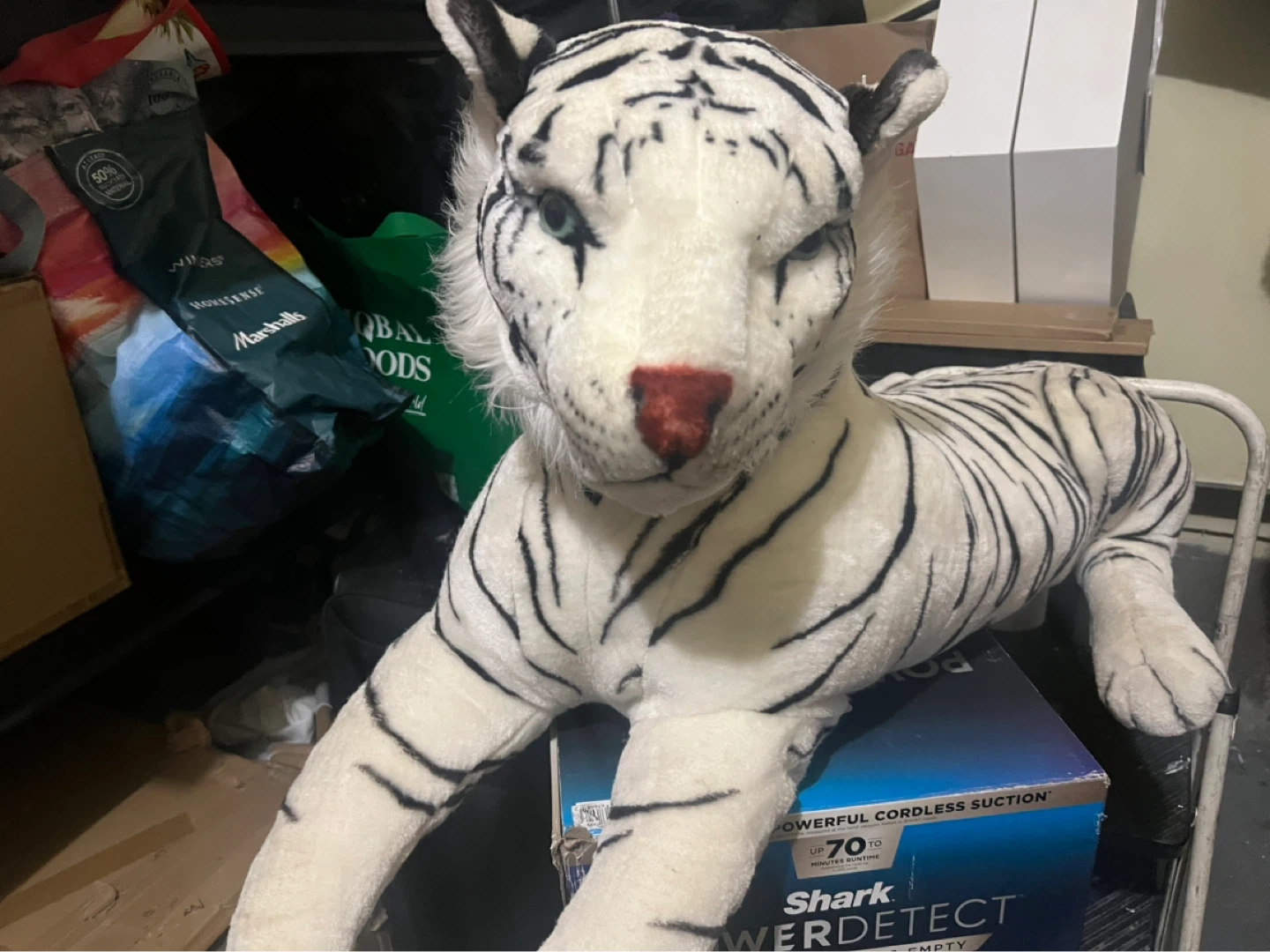 This is a large, soft stuffed white tiger. It's plush and has black stripes all over. Its eyes are bright blue and its nose is red. It's perfect for playtime or as a cuddle buddy!