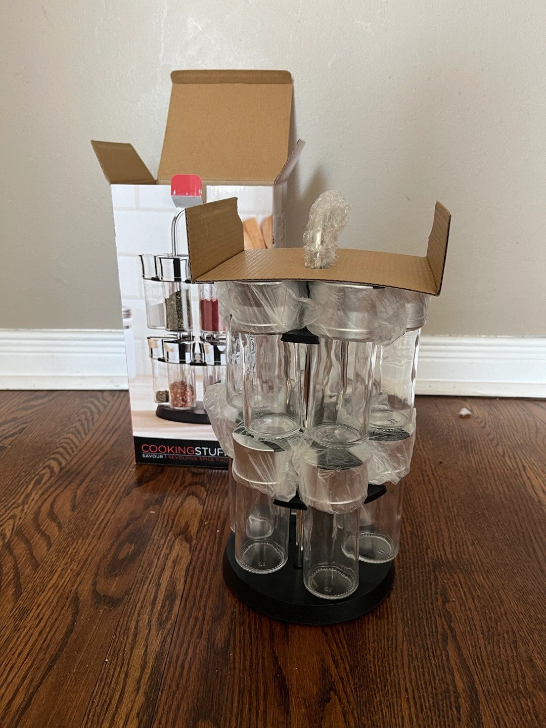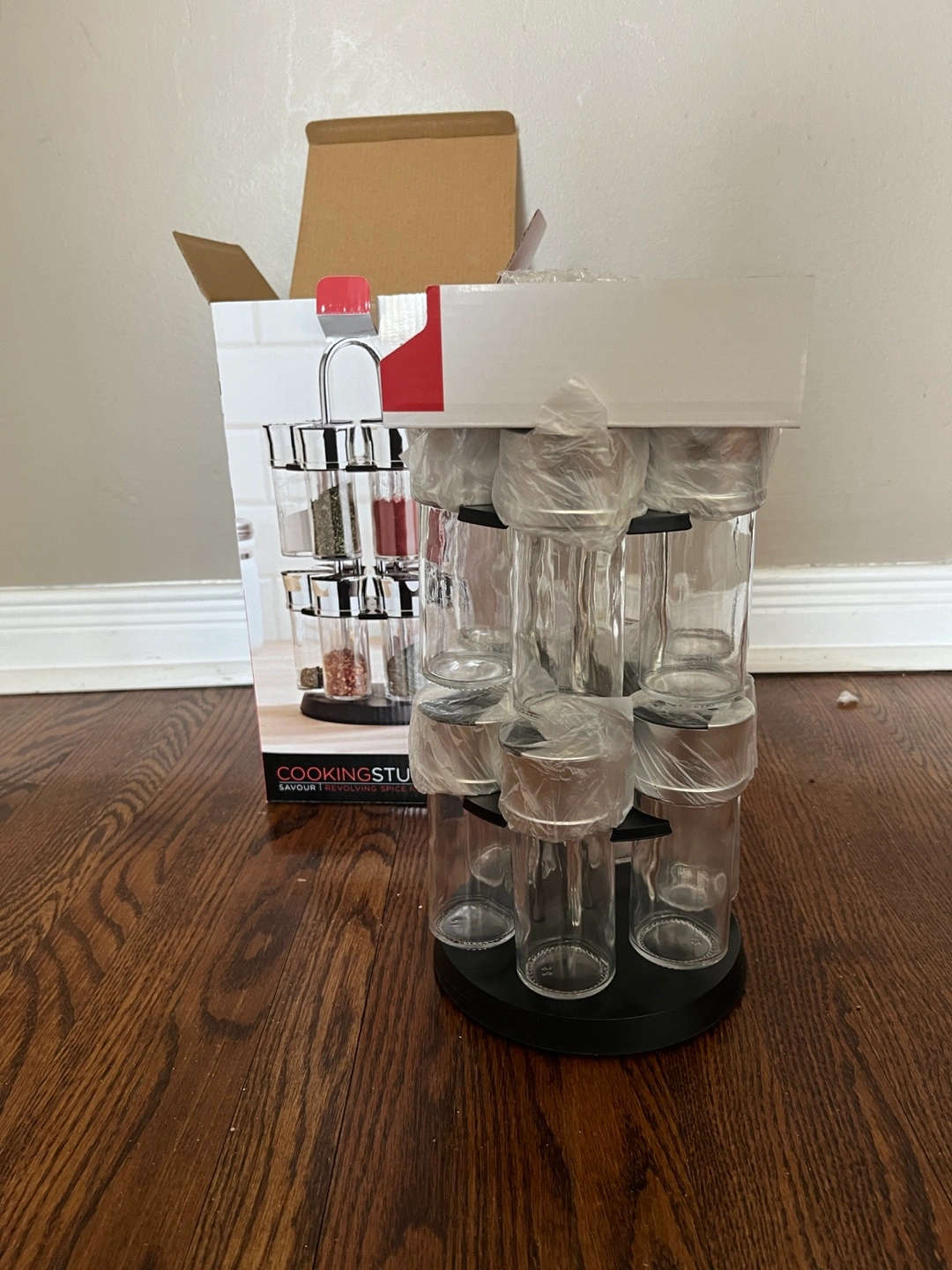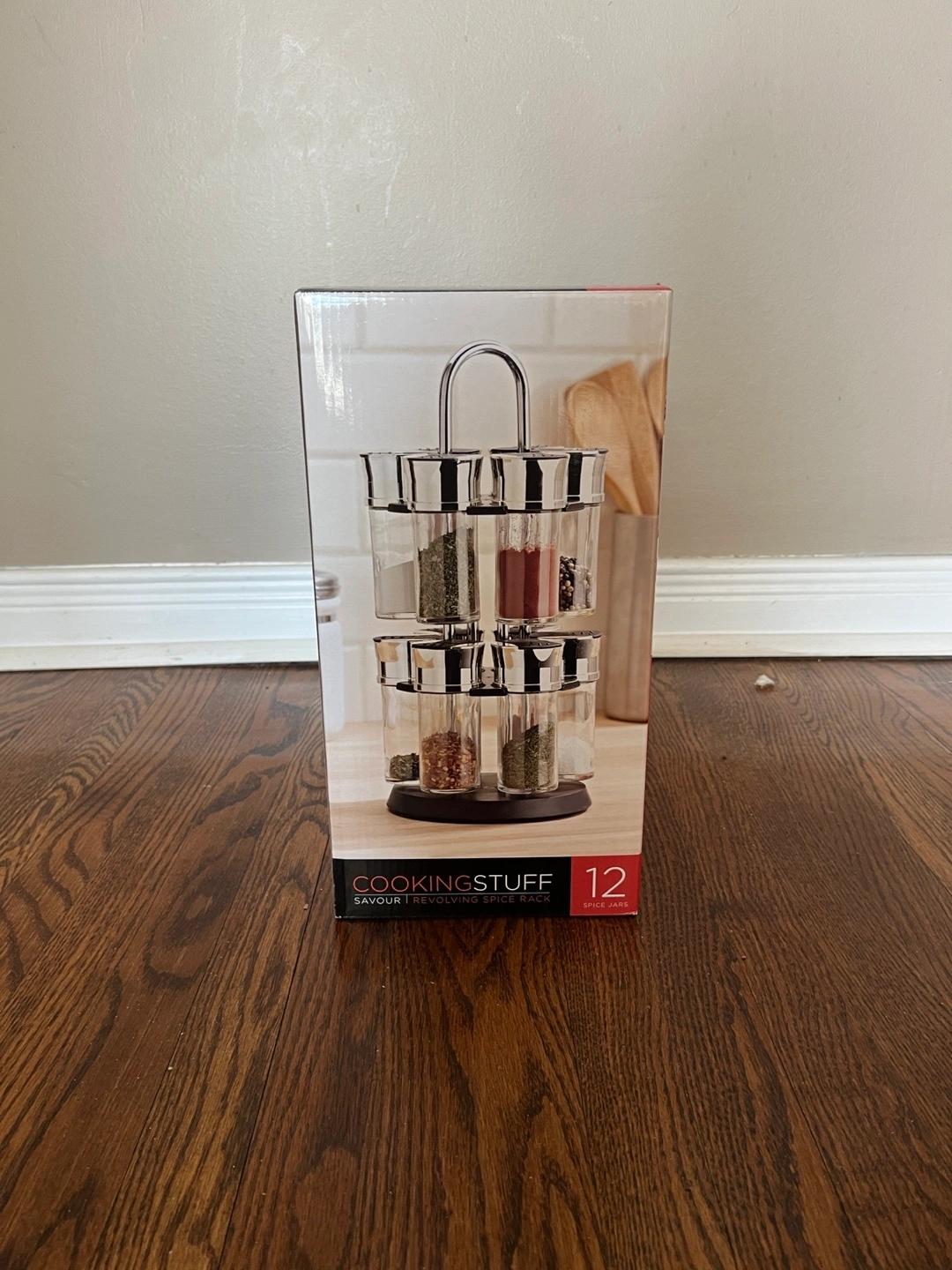 Introducing a new rotating spice rack, elegantly designed and still in its original packaging. This space-saving kitchen has twelve high-quality glass jars, perfect for storing all your favourite spices and seasonings. The sleek, contemporary design adds a touch of sophistication to your kitchen decor and allows for easy access and organization. Its rotating feature ensures you can quickly find and reach for the spice you need while keeping your countertop tidy and clutter-free. Perfect for any culinary enthusiast looking to elevate their cooking experience!