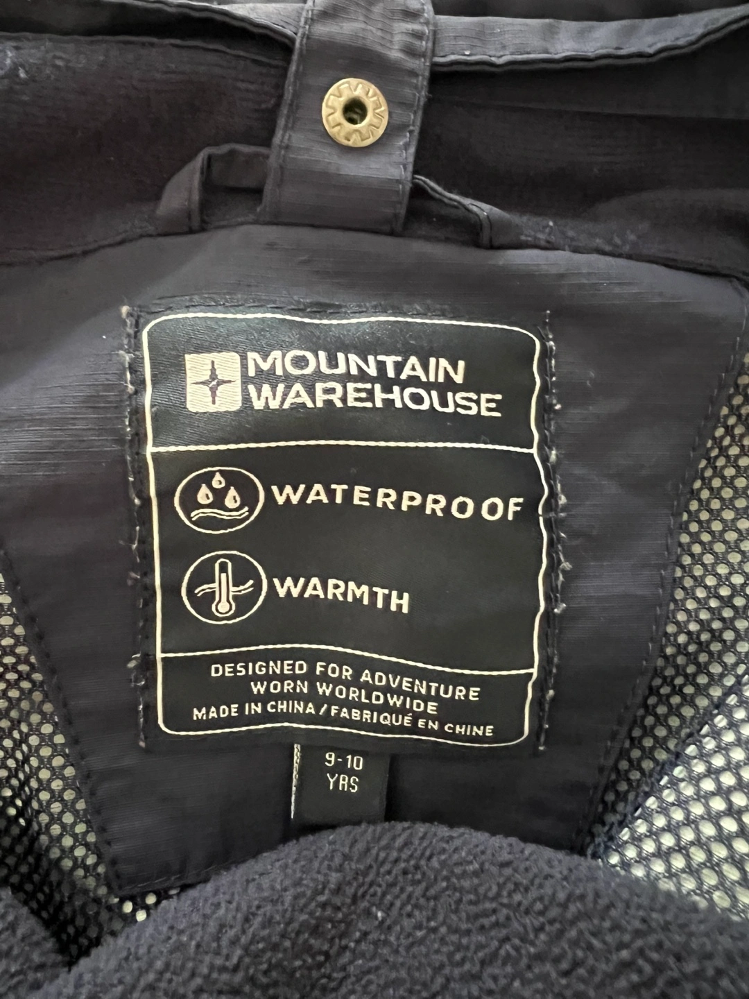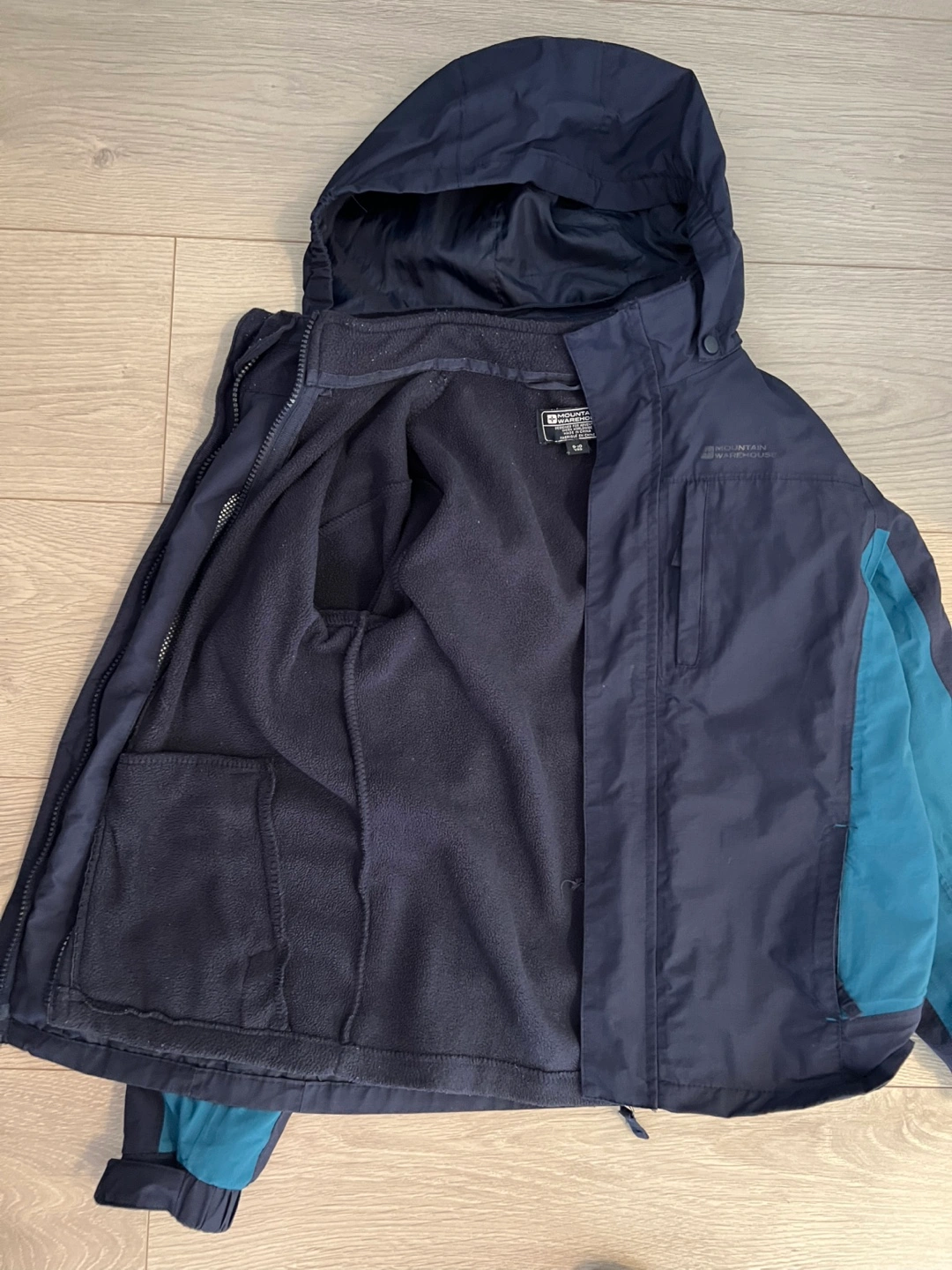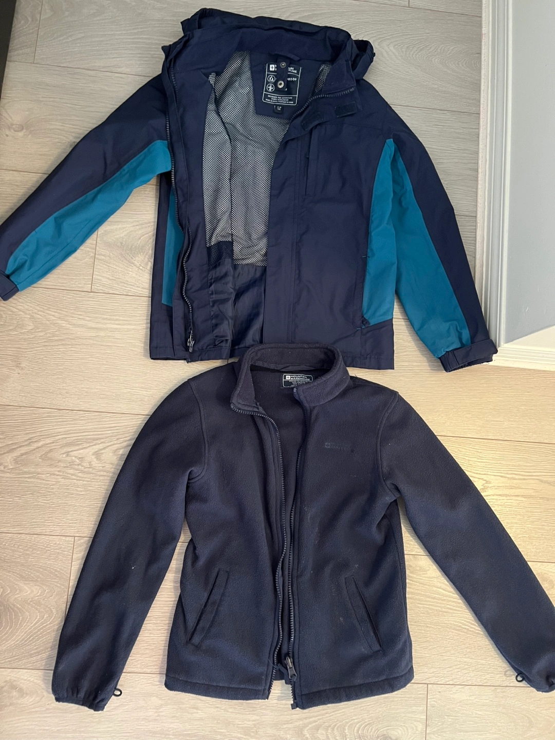 Two-piece jacket set for boys. Includes a waterproof and warm winter jacket, and a fleece jacket. Both are navy blue. Size 9-10 years.