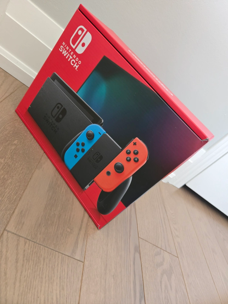 unopened Brand new Nintendo Switch console. Neon blue and red Joy-Cons. Still in original packaging. Includes all original accessories.