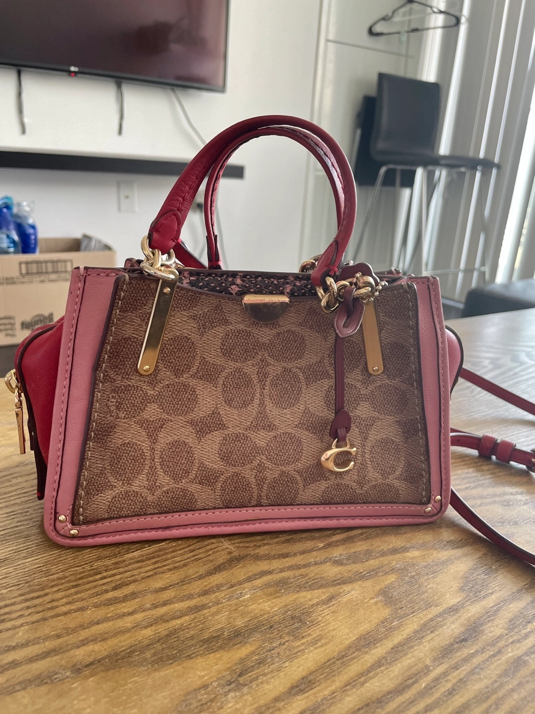 Coach Mini crossbody handbag. Red leather and signature canvas. Features dual top handles, a detachable strap, and zip closure. Interior has a small zipped pocket. Excellent for everyday use. No scratch. Good condition.