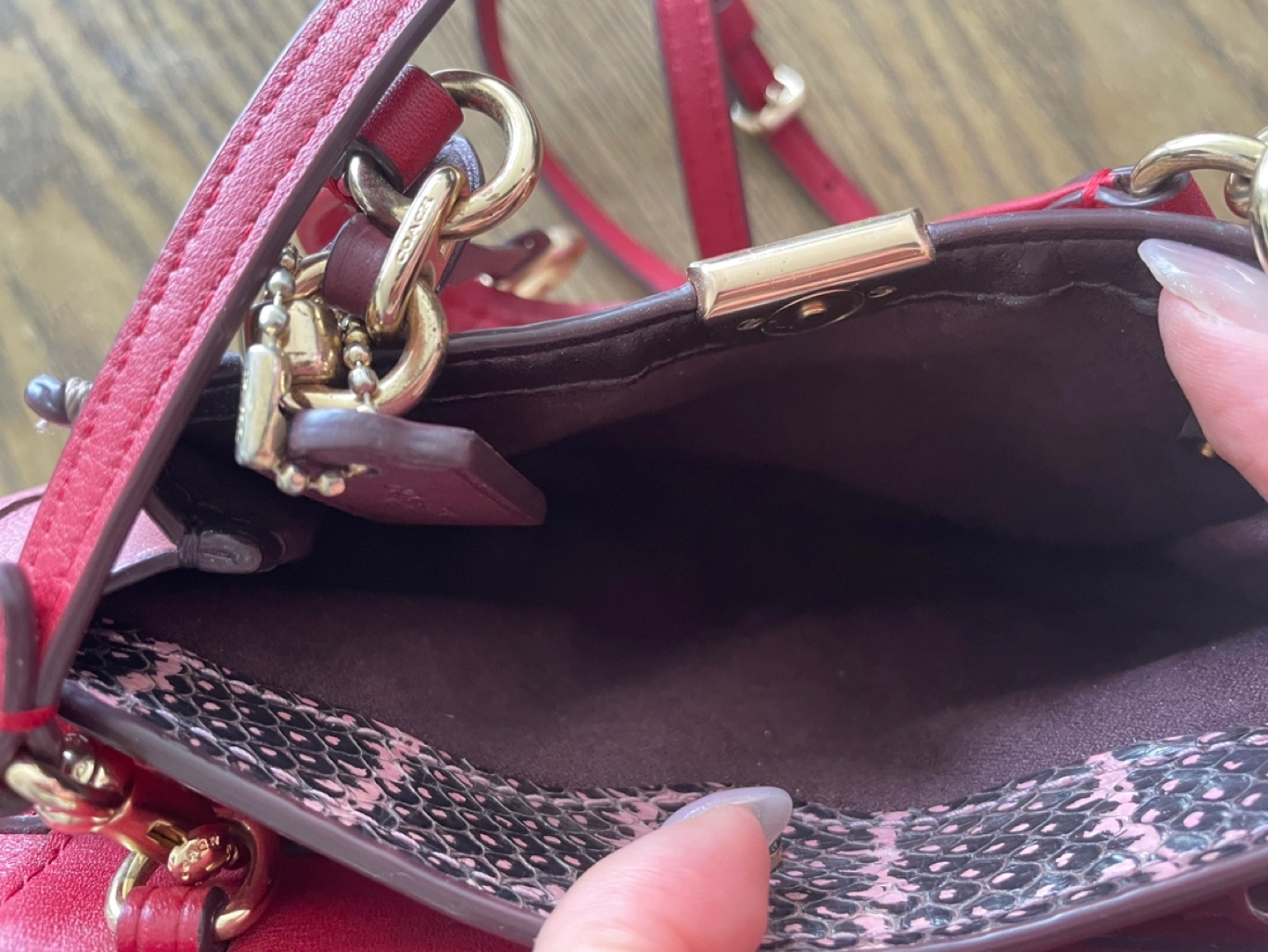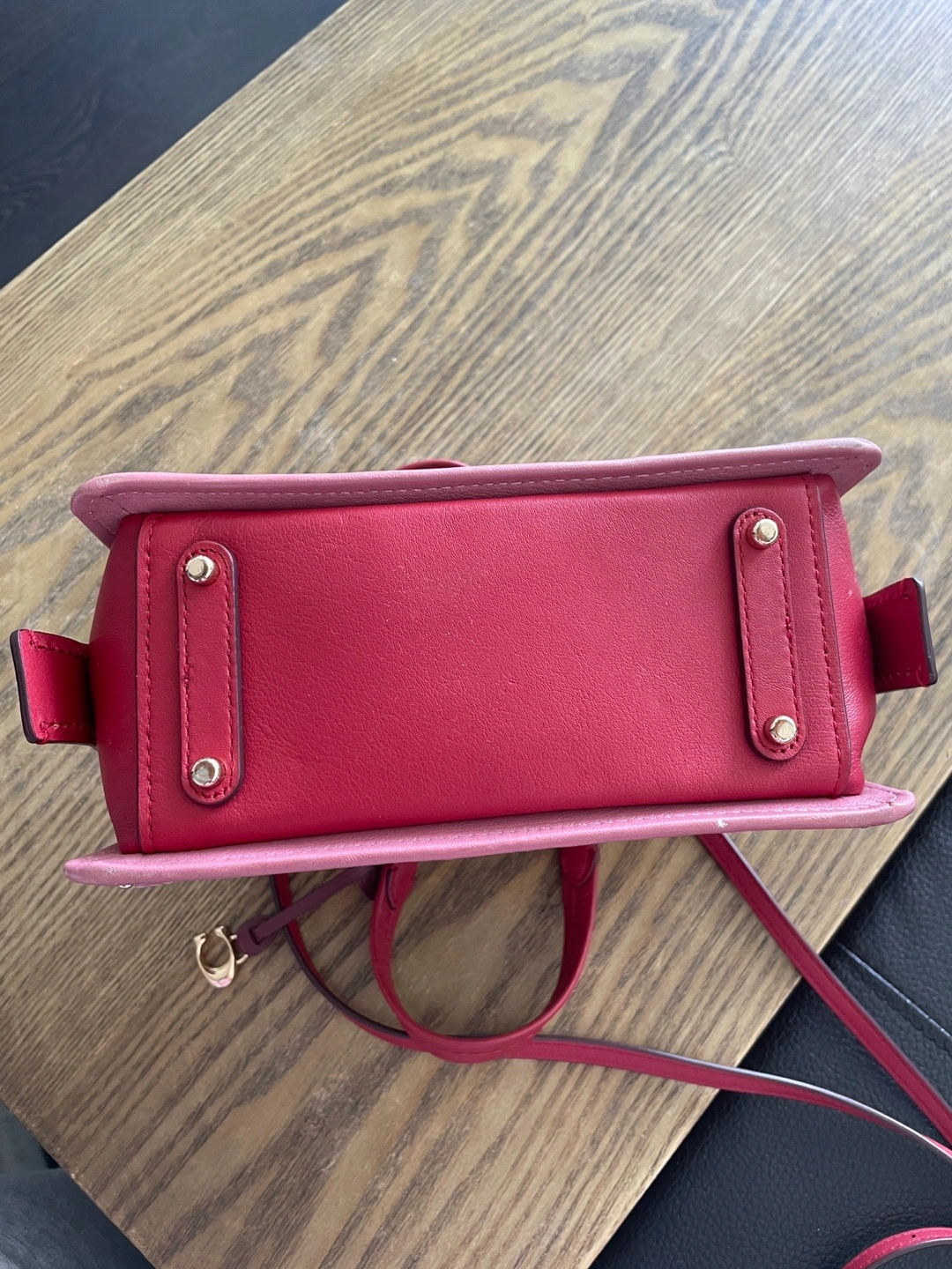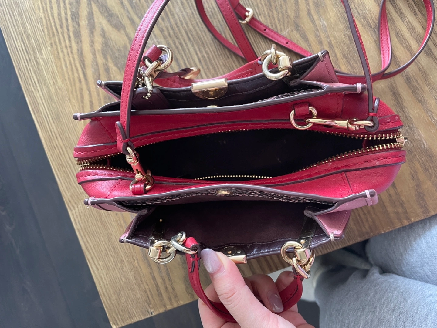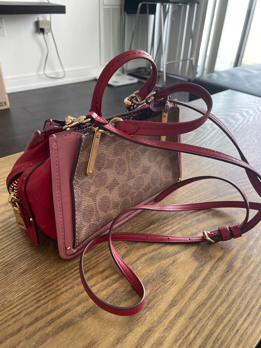 Coach Mini crossbody handbag. Red leather and signature canvas. Features dual top handles, a detachable strap, and zip closure. Interior has a small zipped pocket. Excellent for everyday use. No scratch. Good condition.