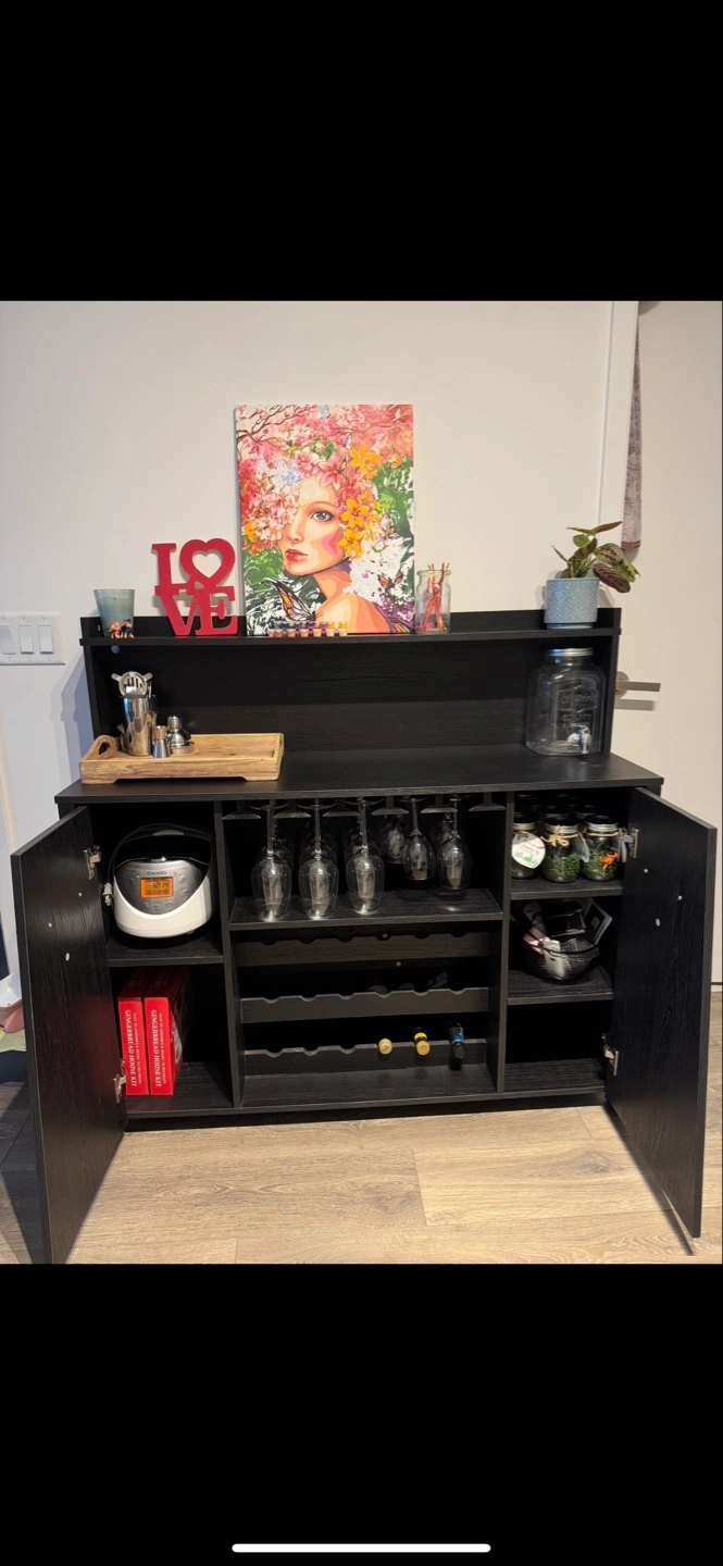 Stylish black bar cabinet. Features wine rack, storage, and a top shelf. Perfect for entertaining. Good condition.