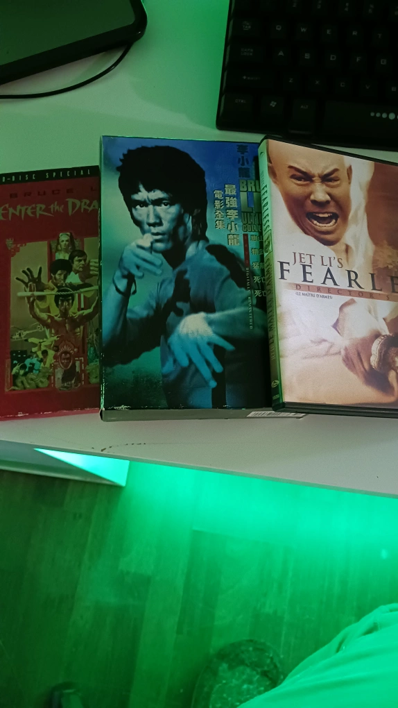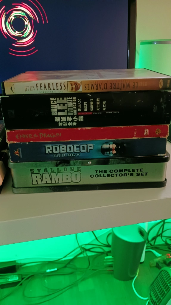 Collection of classic action and martial arts DVDs. Includes Bruce Lee, Jet Li, Sylvester Stallone, and Clint Eastwood films. Great for collectors or movie buffs. Various titles included.
