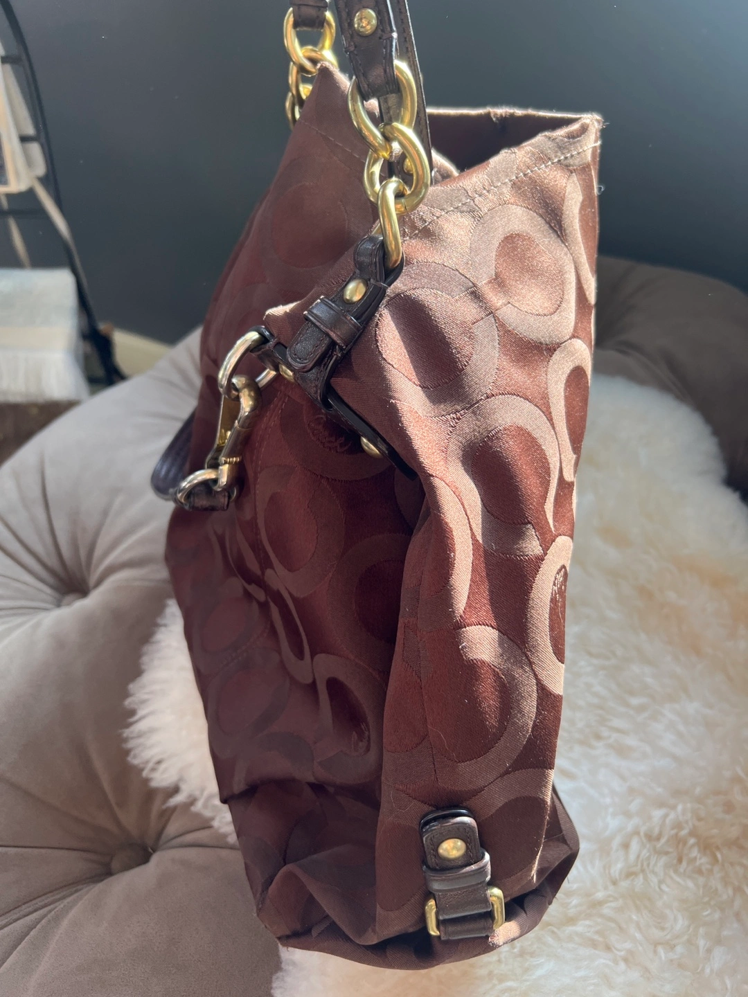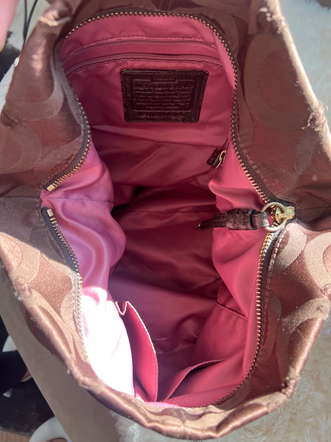 Brown Coach tote bag. Features signature C pattern. Gold-tone hardware. Shoulder strap and top handles. Interior zipper pocket and slip pockets. Zipper closure. Well used but in great condition. Some wear and tear on leather hardware as shown in picture.