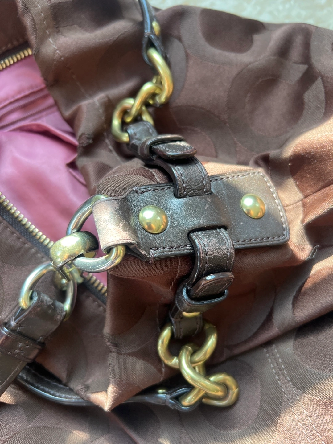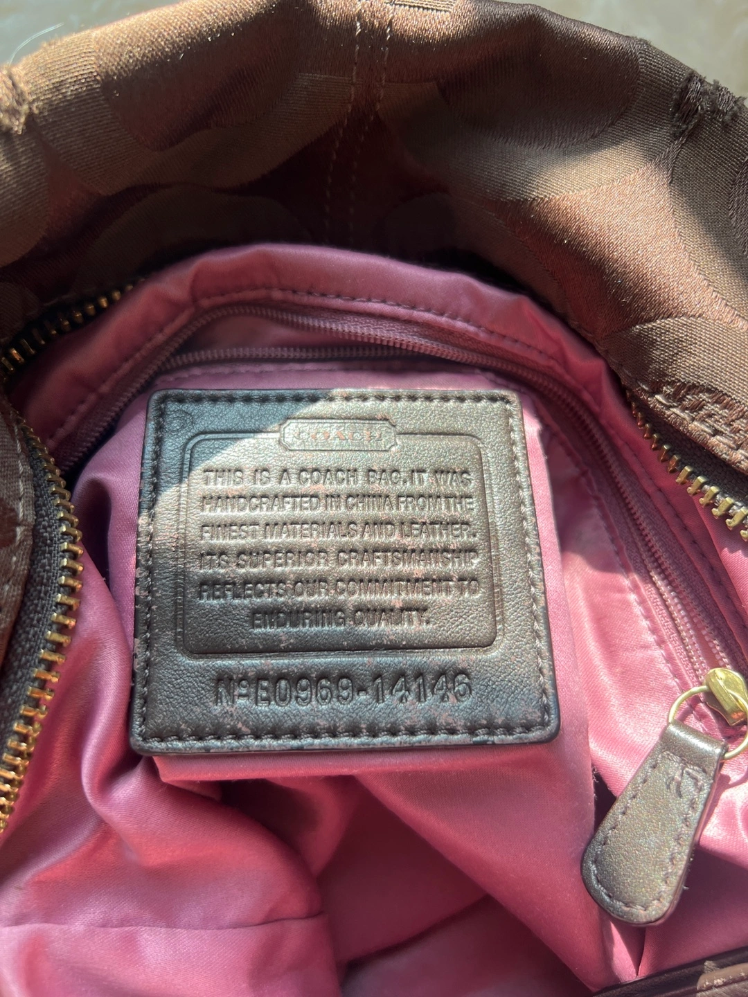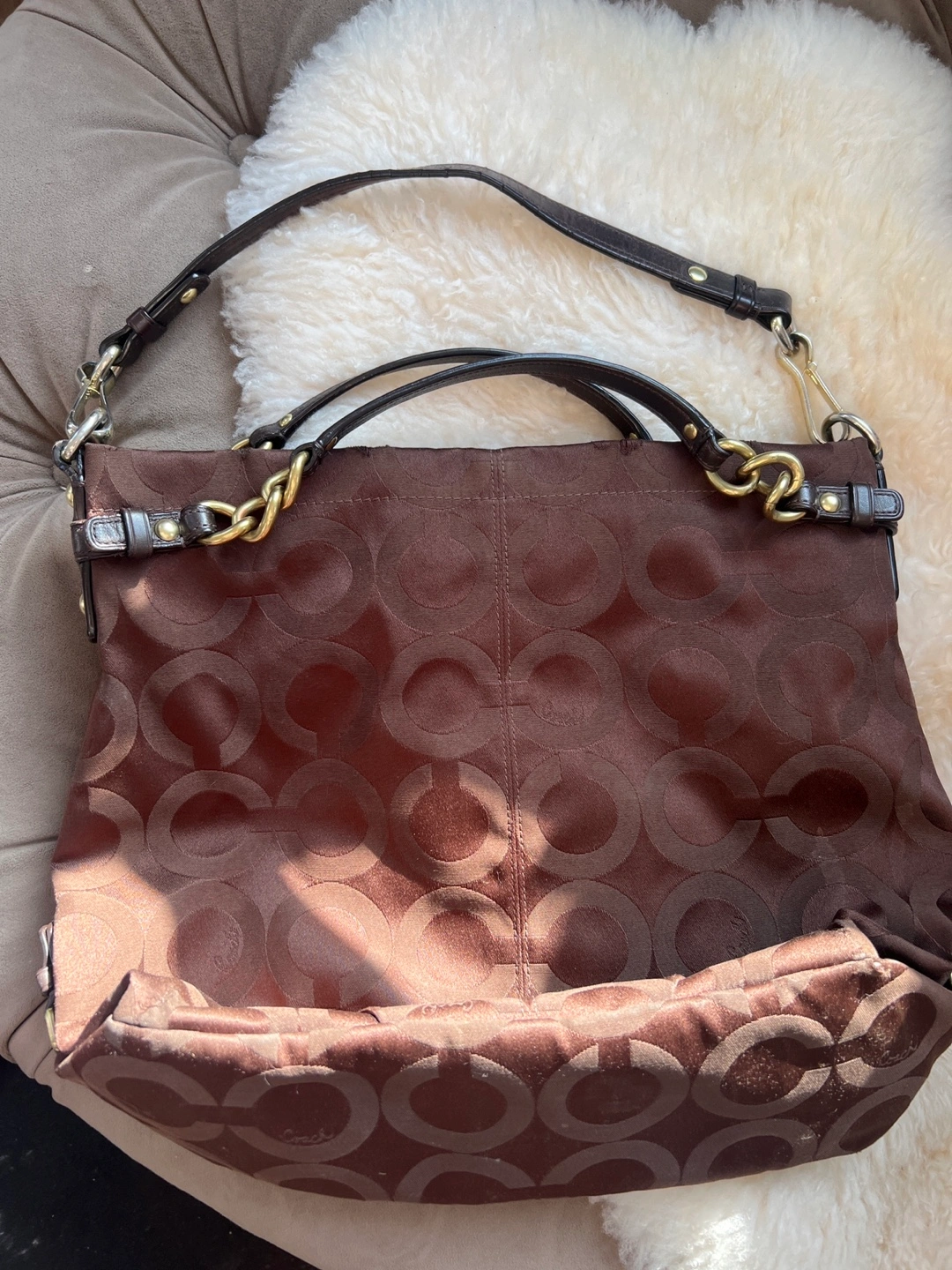 Brown Coach tote bag. Features signature C pattern. Gold-tone hardware. Shoulder strap and top handles. Interior zipper pocket and slip pockets. Zipper closure. Well used but in great condition. Some wear and tear on leather hardware as shown in picture.