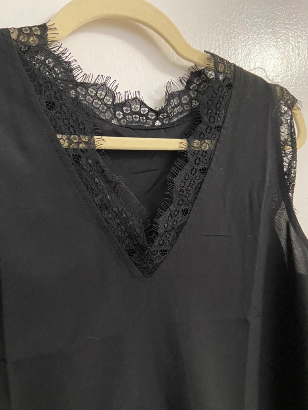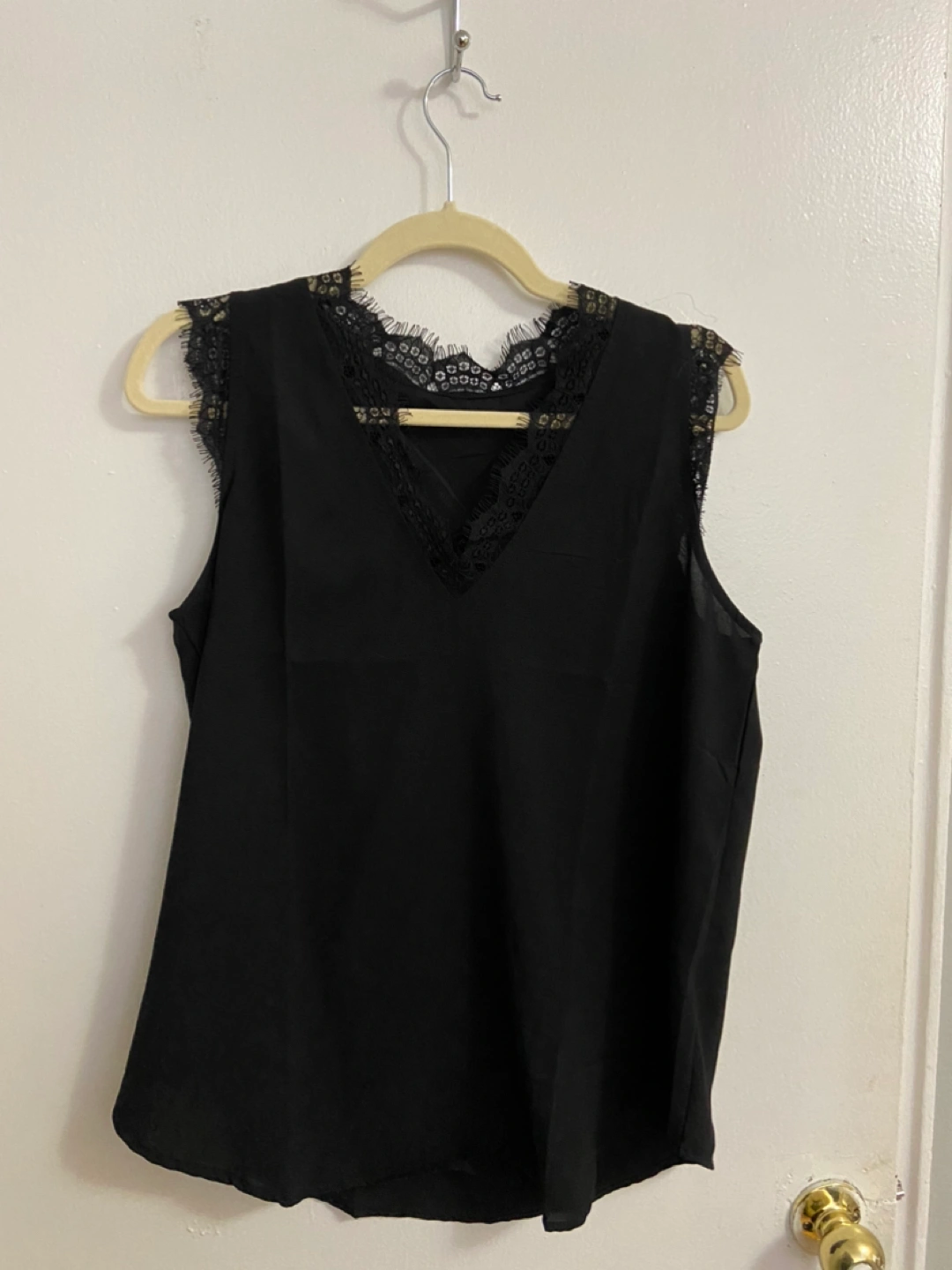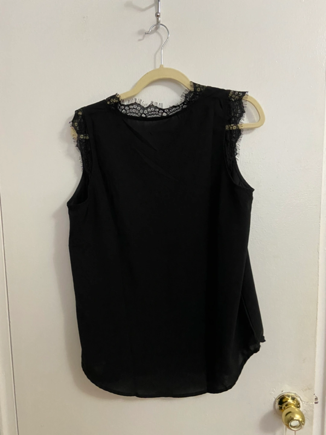 Size large. Simple black tank top with lace detailing around the neck and sleeves. Perfect top for work, just haven’t needed it in my closet as of late and looking for someone who will wear it more often.