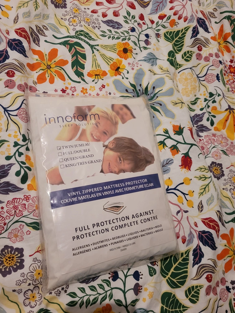 New in package. twin size mattress protector. Vinyl material. Full protection against allergens, dust mites, bed bugs, liquids, bacteria and mold. Zippered closure.