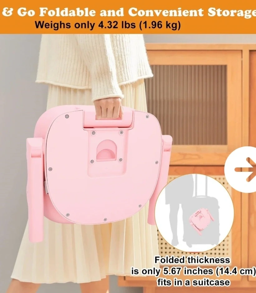 This pink foldable high chair booster seat is perfect for travel and convenient storage. It's designed for ages 6 months to 2 years and supports a max weight of 33.07 lbs (15 kg). The chair weighs only 4.32 lbs (1.96 kg) and folds to a thickness of 5.67 inches, fitting easily into a suitcase. It can also be used to turn any regular chair into a high chair for your little one. The seat dimensions are 15.47" (height), 15.08" (width), and 16.14" (depth).