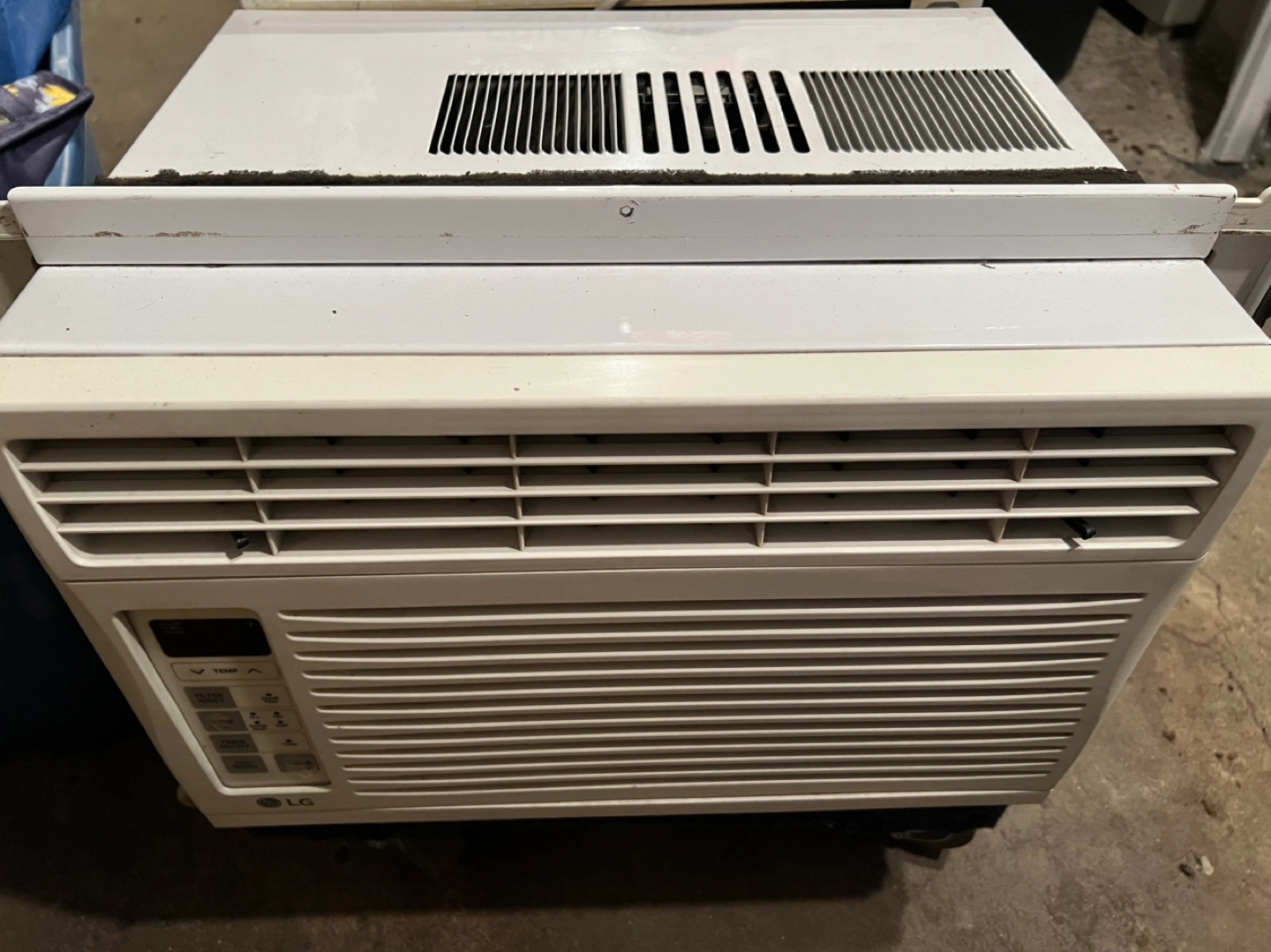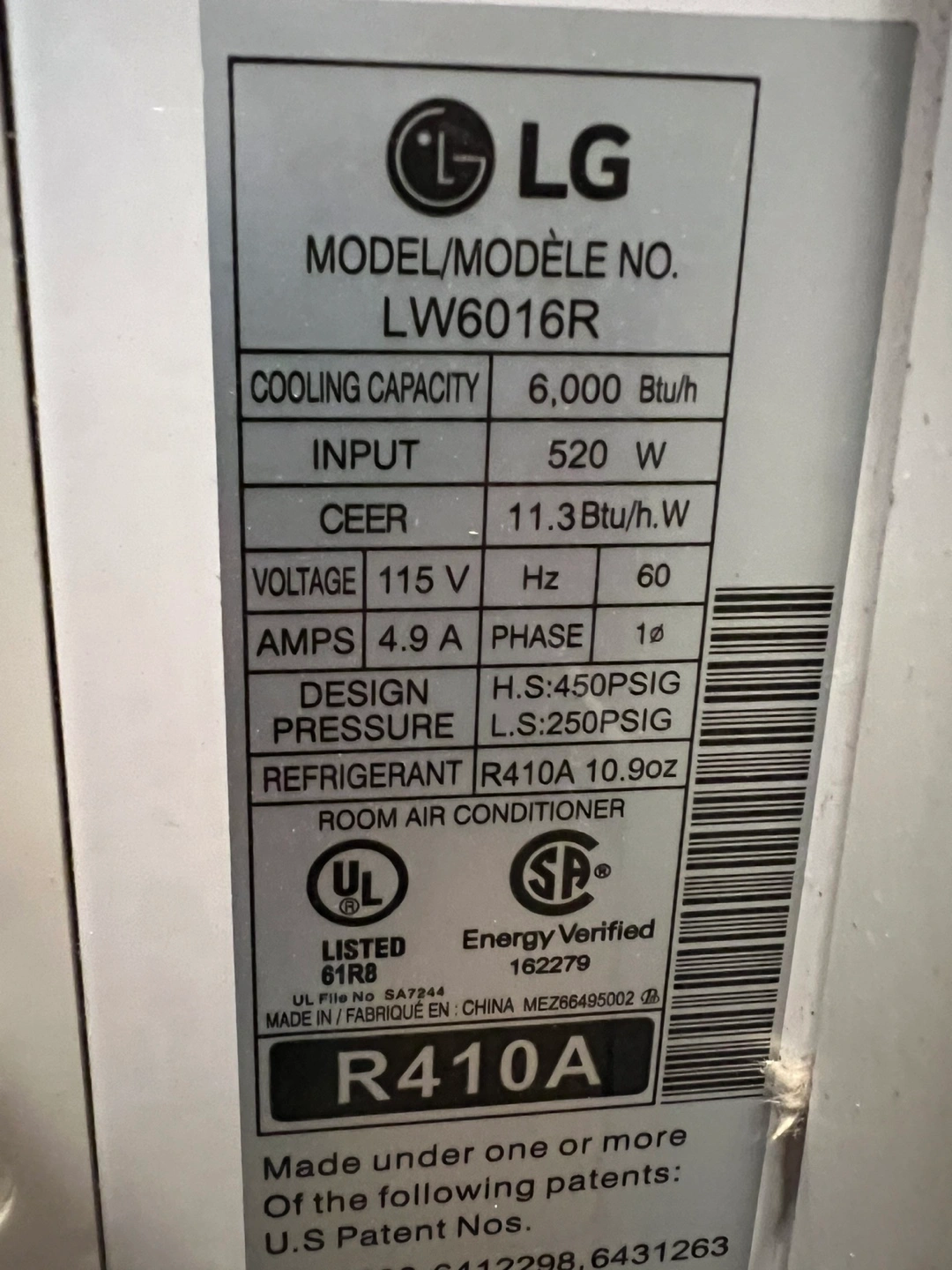 Used LG window air conditioner. Model LW6016R. 6000 BTU cooling capacity. 520W input. 115V voltage. Includes specifications label. R410A refrigerant.