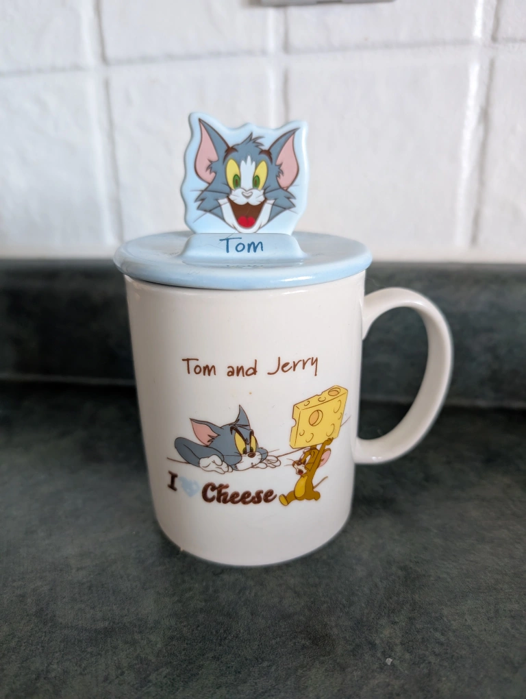 31Adorable Tom and Jerry mug. Features Tom's face on the lid. Cute design. Perfect for coffee or tea. lid can hold a phone lol