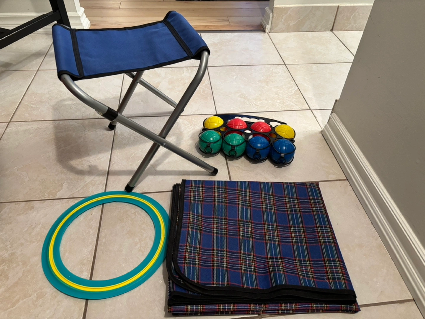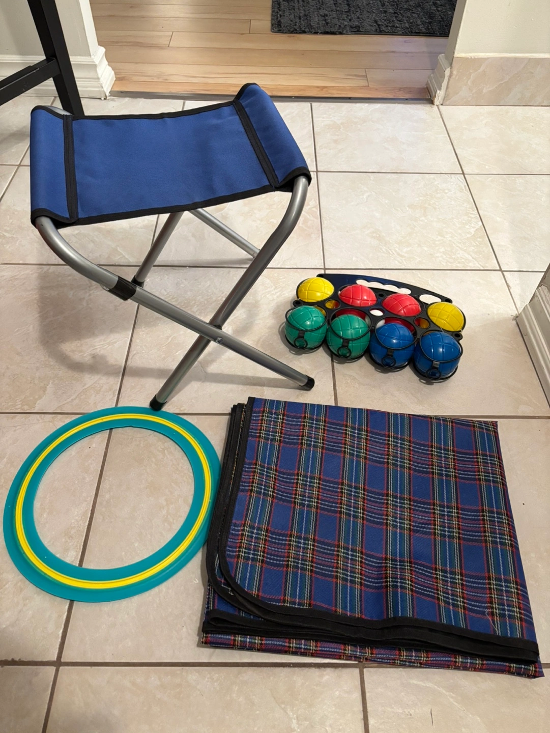 Portable bocce ball set includes eight balls and carrying case, frisbee, folding chair, and a plaid picnic blanket (55β x 47β) Great for outdoor games.