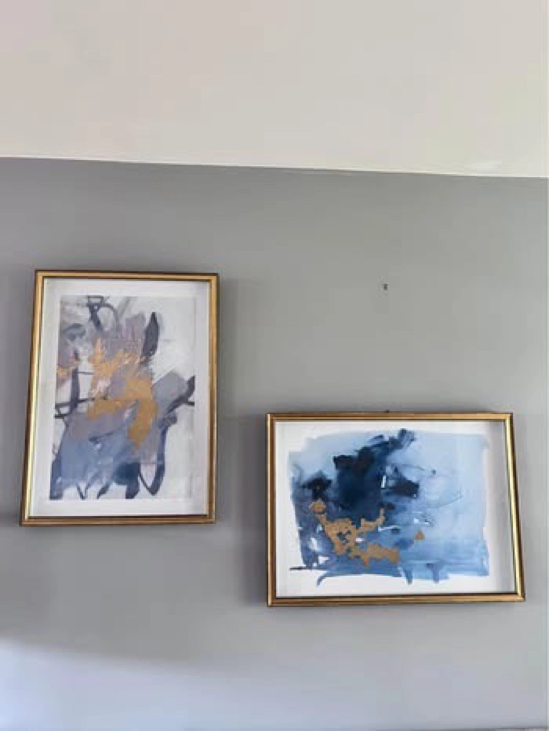 Beautiful set of two framed abstract art prints. Gold frames. Blues and gold accents. Modern and elegant style. Perfect for adding a touch of sophistication to any room.