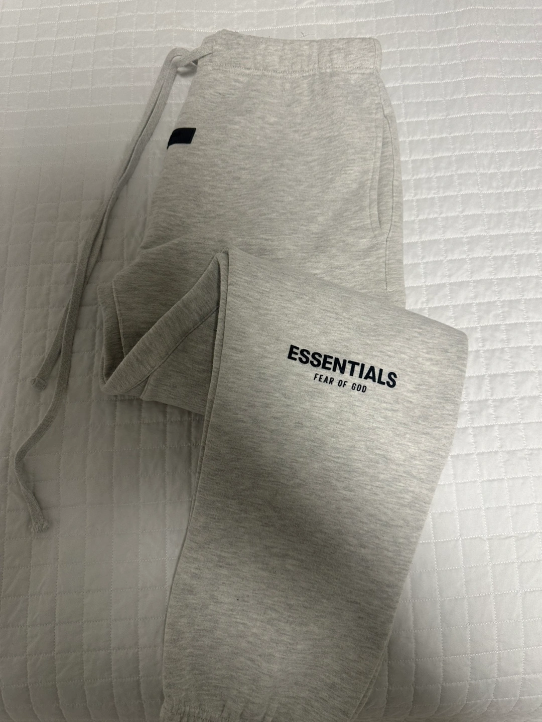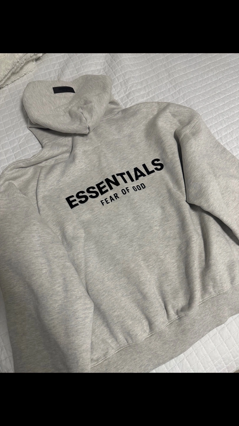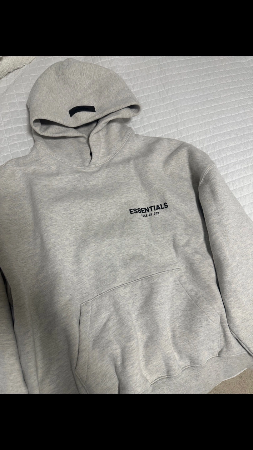 Grey hoodie and joggers set. Features Essentials Fear of God branding. Comfortable, casual wear.
