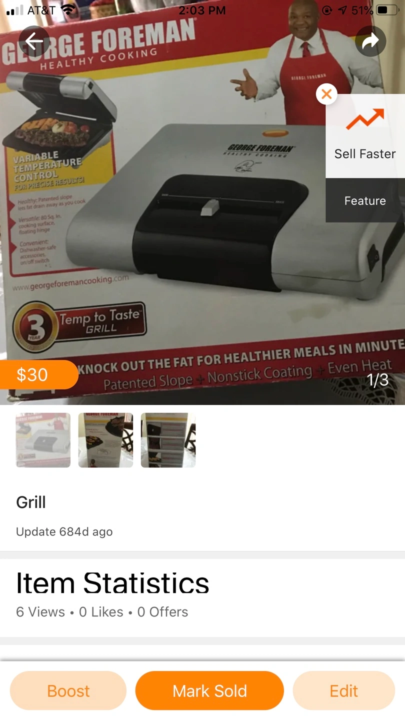 George Foreman grill. Variable temperature control. Patented slope, nonstick coating, even heat. 80 sq in cooking surface. Dishwasher-safe accessories.