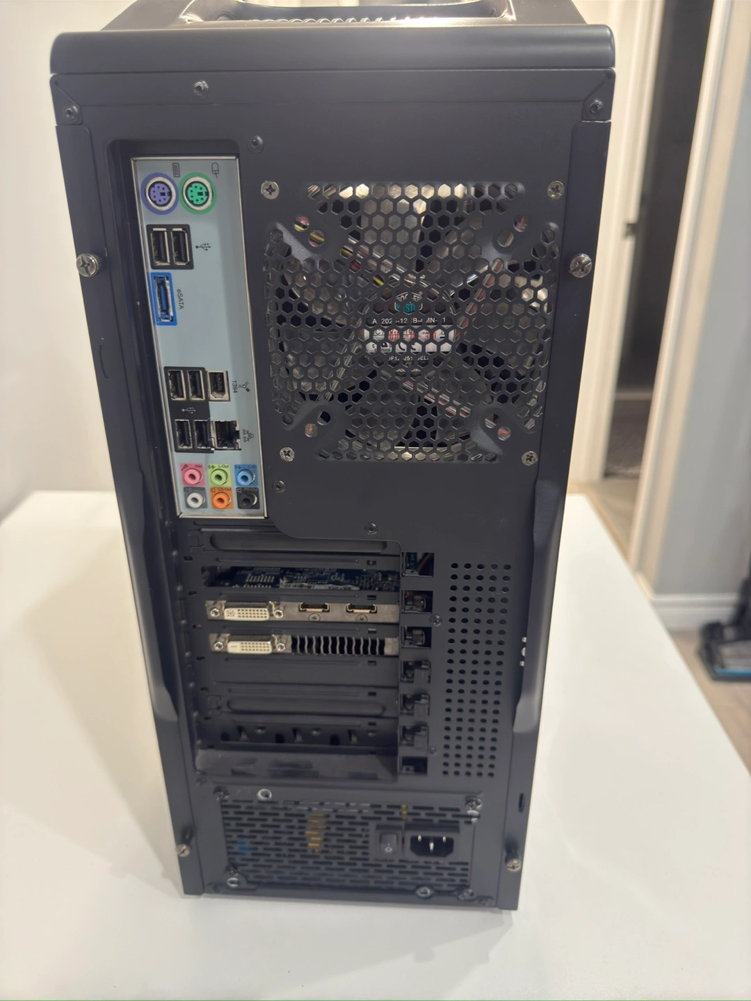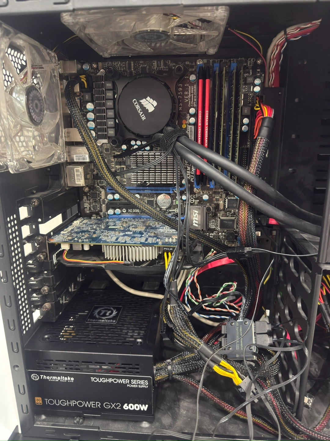 20Costum built Pc, no longer need it. 48 Gigs or RAM DDR3 Motherboard is MSI x58m CPU Intel Xeon X5680 Graphics card NVIDIA GTX 750 OC Psu thermaltake 600 Watts non-modular Corsair liquid cooling AIO Case, Cooler Master Storm Does not come with SSD nor HDD. Nice looking Pc good for the average gaming. Cash only, no e-transfers.