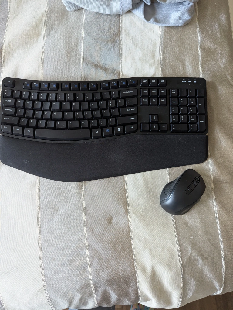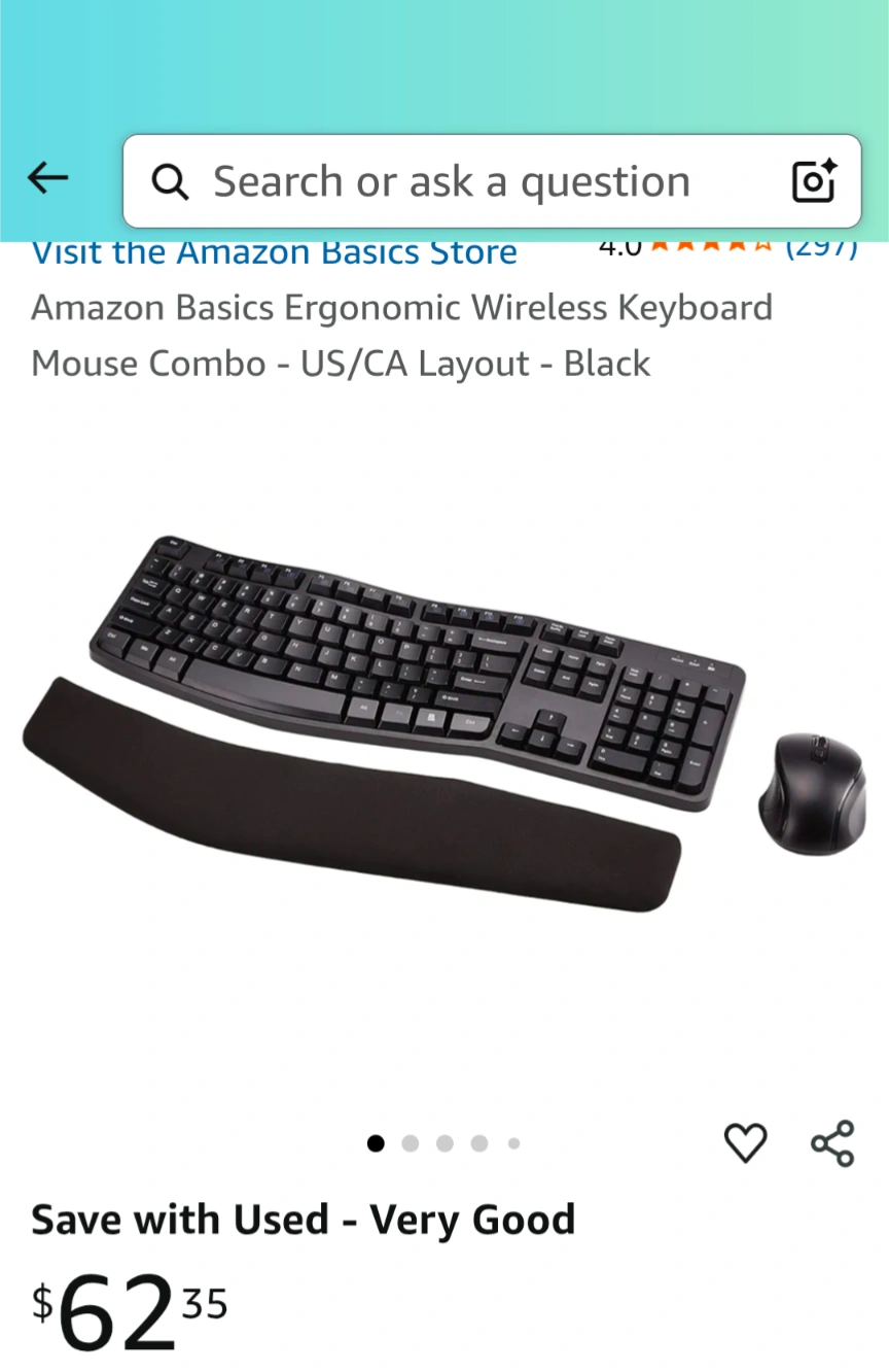 Amazon Basics ergonomic keyboard and mouse combo. Wireless. US/CA layout. Black. Includes wrist rest.
