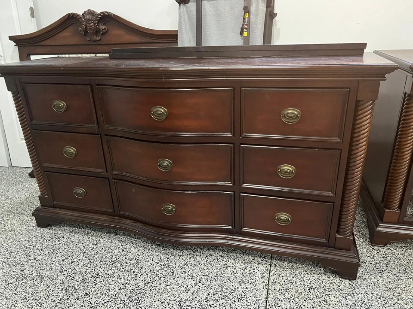 Beautiful dark wood bedroom set. Includes a dresser with eight drawers and a matching mirror. Ornate details. Solid wood construction. Some minor wear.
