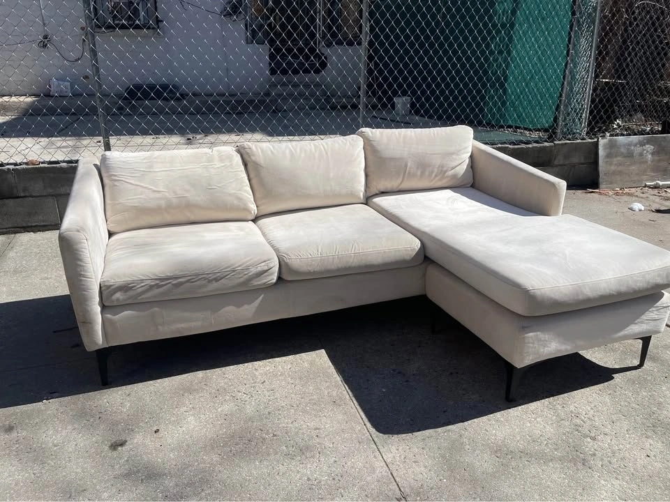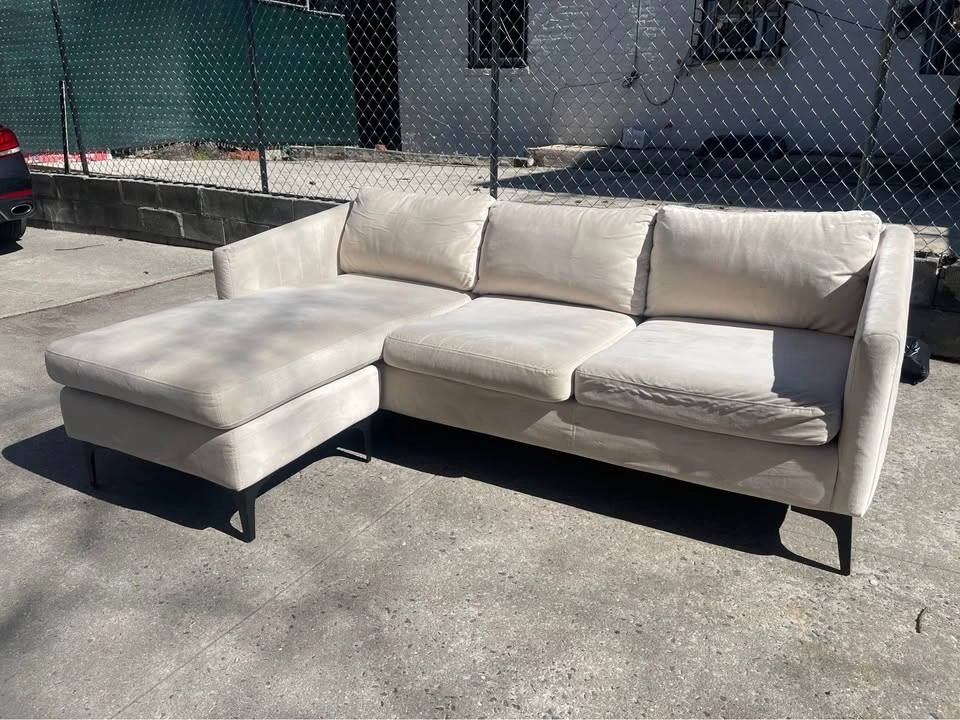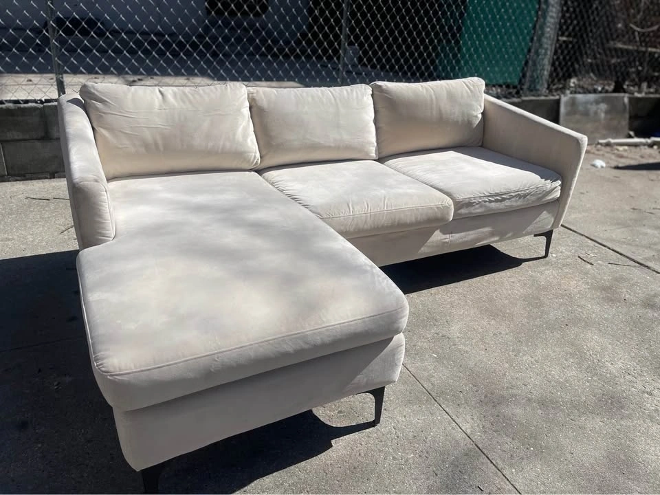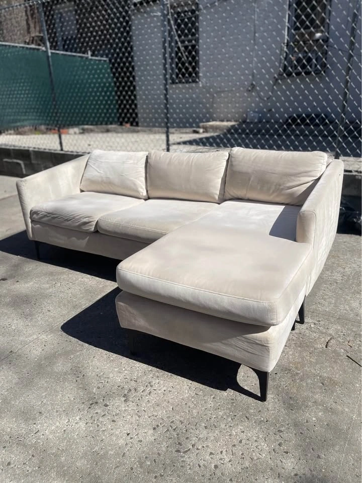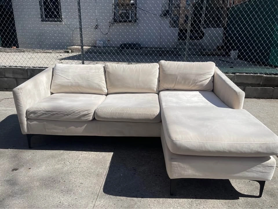 Light beige color suede like sectional couch seats 3-4 people comfortably. Beautiful beige sectional couch with reversible chaise. This sofa is extremely comfortable and perfect for relaxing, watching movies, or hosting guests. The neutral color works well with almost any living room style. The cushions are thick and plush. Covers are removable and machine washable and the couch has a modern, cozy look that fits great in apartments, houses, or family rooms. I don’t have the dimensions but it fits in any room. Pick up is in the Bronx.