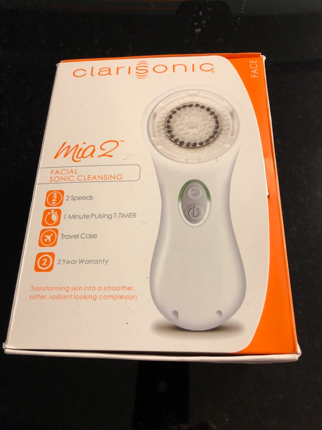 Clarisonic Mia 2. Facial sonic cleansing device. Two speeds. One minute pulsing T-timer. Includes travel case. Transforms skin.
