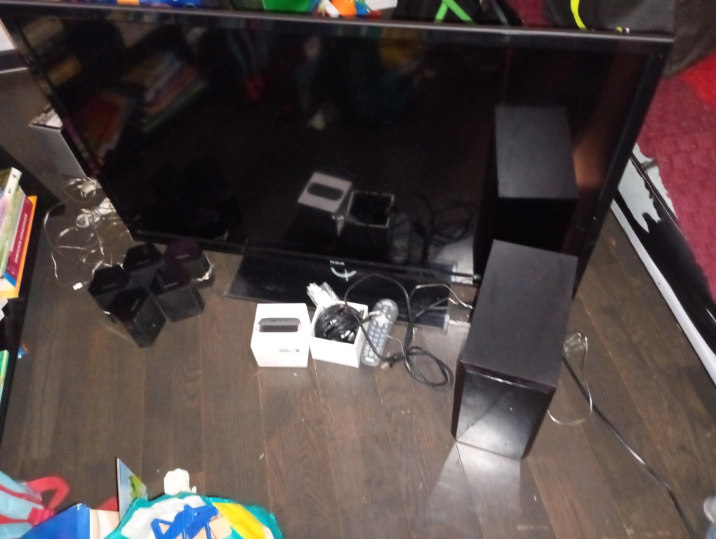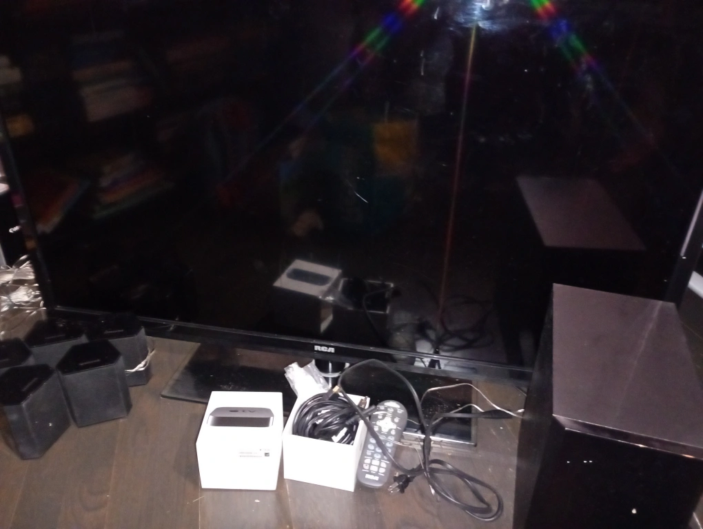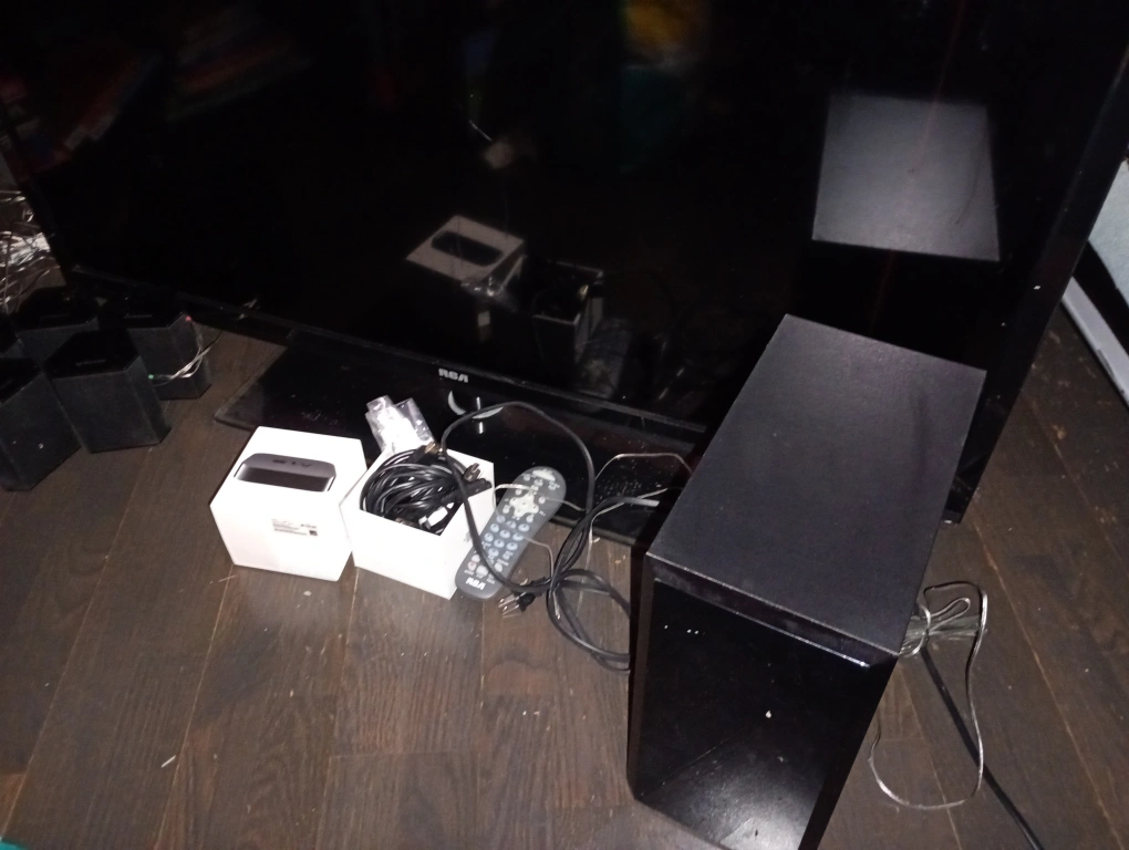 Flat screen RCA television with Samsung 5.1 surround sound speakers and subwoofer. Includes remote and cables. Apple TV box also included.