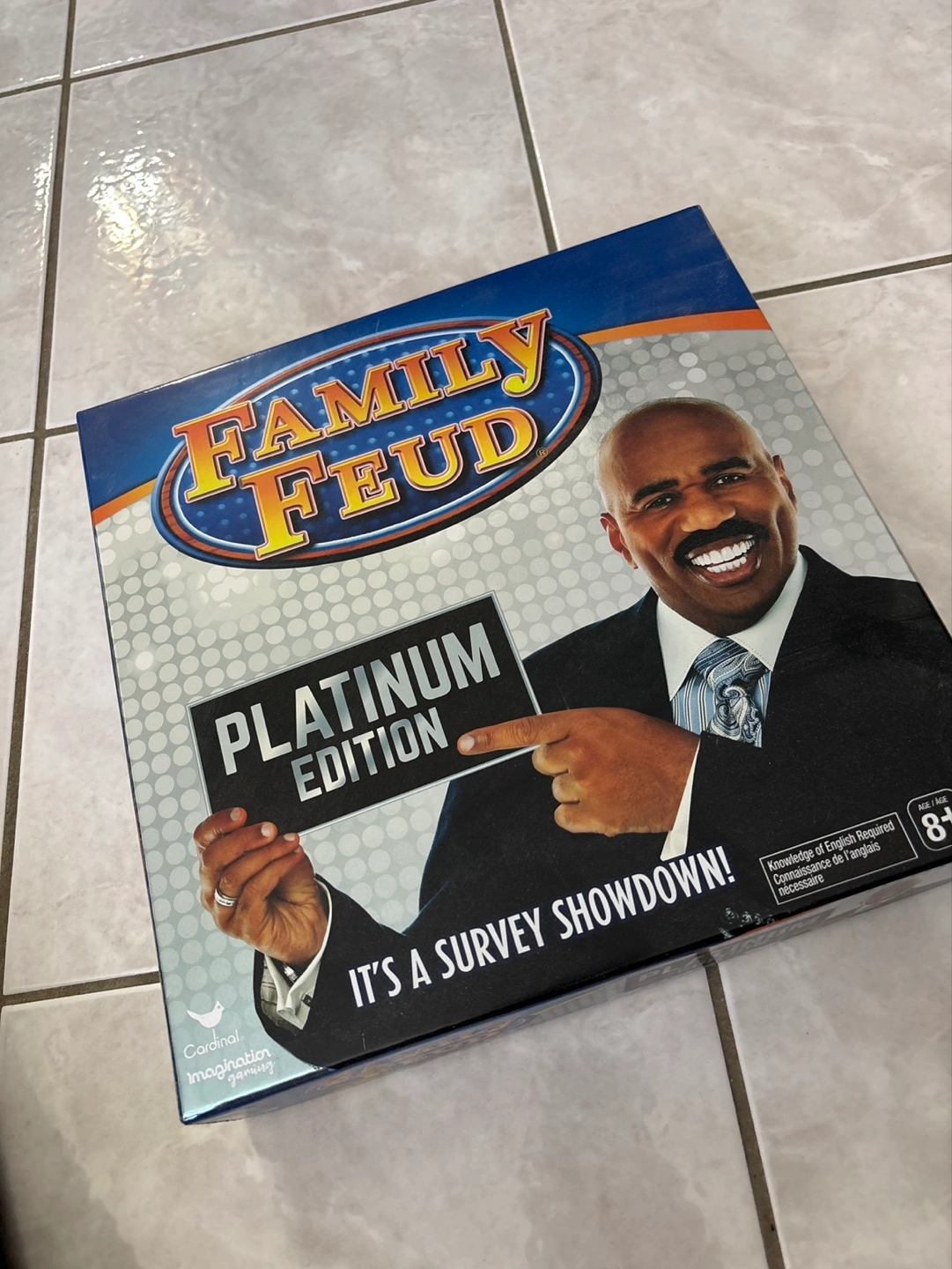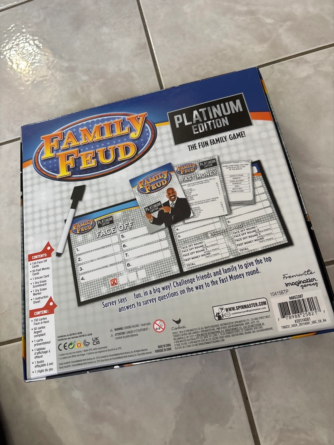 Family Feud Platinum Edition board game. Includes game board, cards, and dry-erase markers. Survey says...fun in a big way! Challenge friends and family to give the top survey answers. It's a survey showdown!