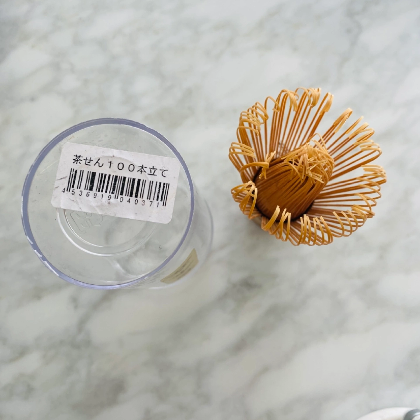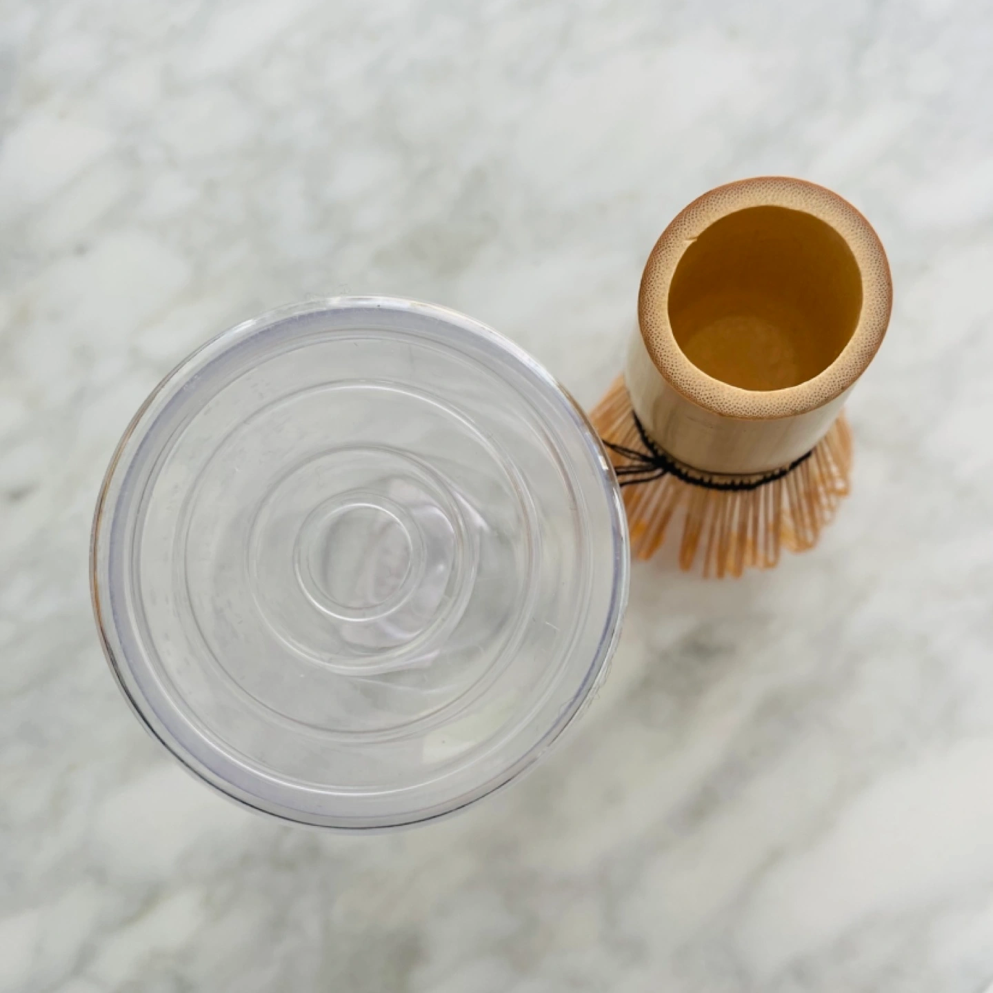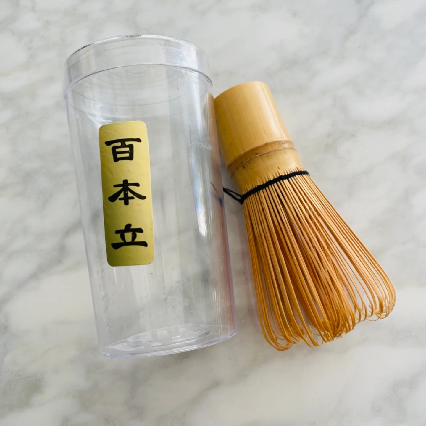 Bamboo matcha whisk with plastic container. Perfect for preparing and whisking your matcha powder to creamy perfection. Includes a small plastic storage container with lid for the whisk.