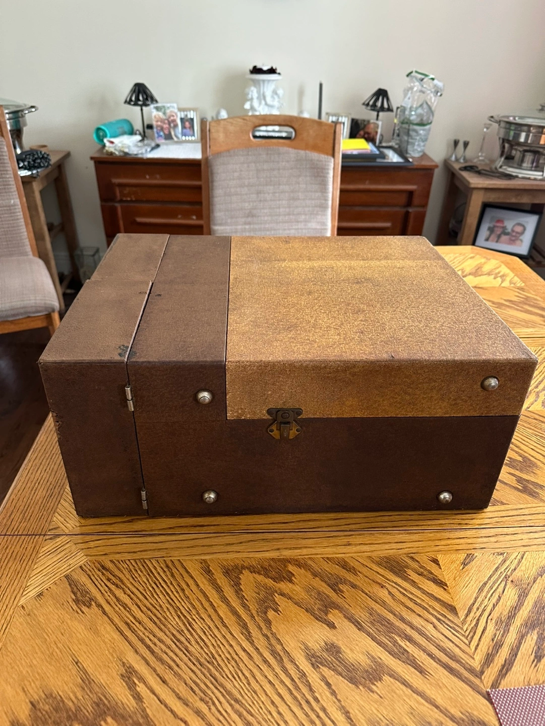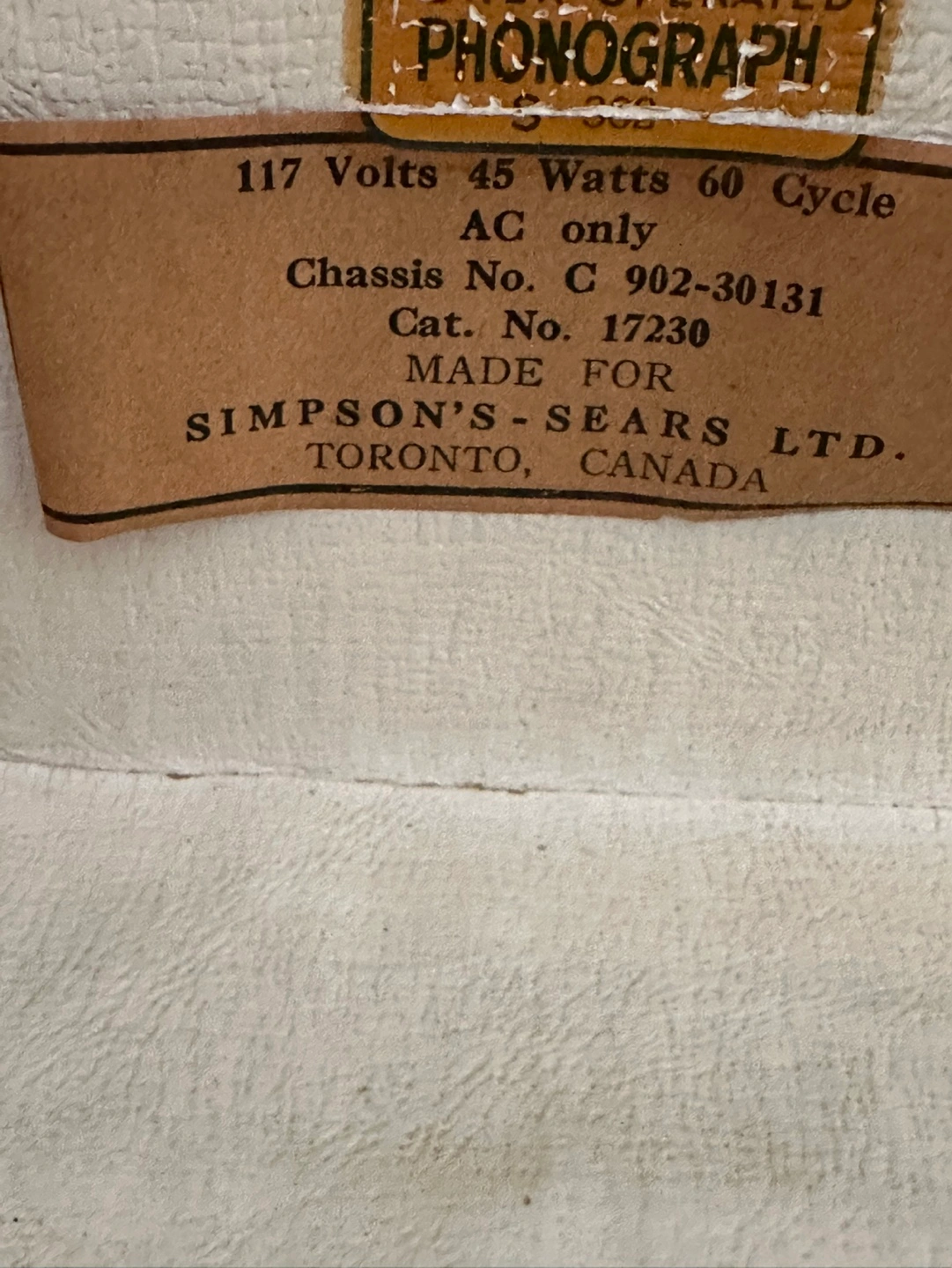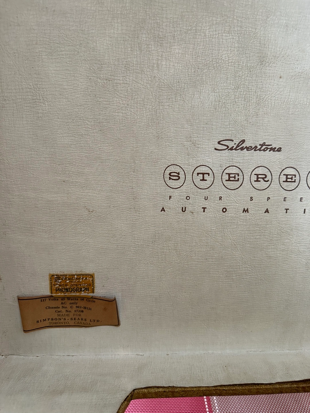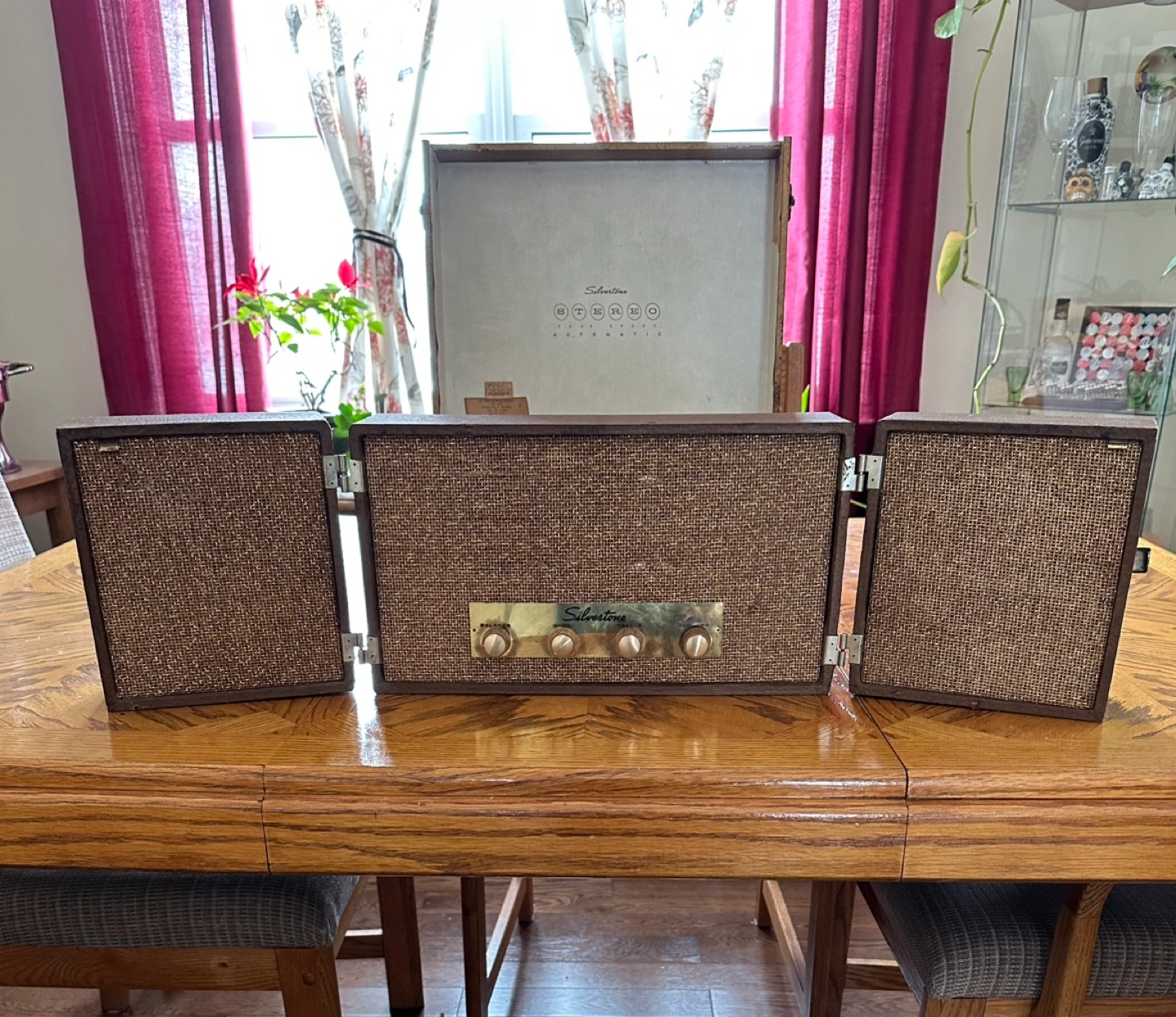 Vintage record player. Three speakers. Cabinet opens to reveal turntable. Shows wear consistent with age.
