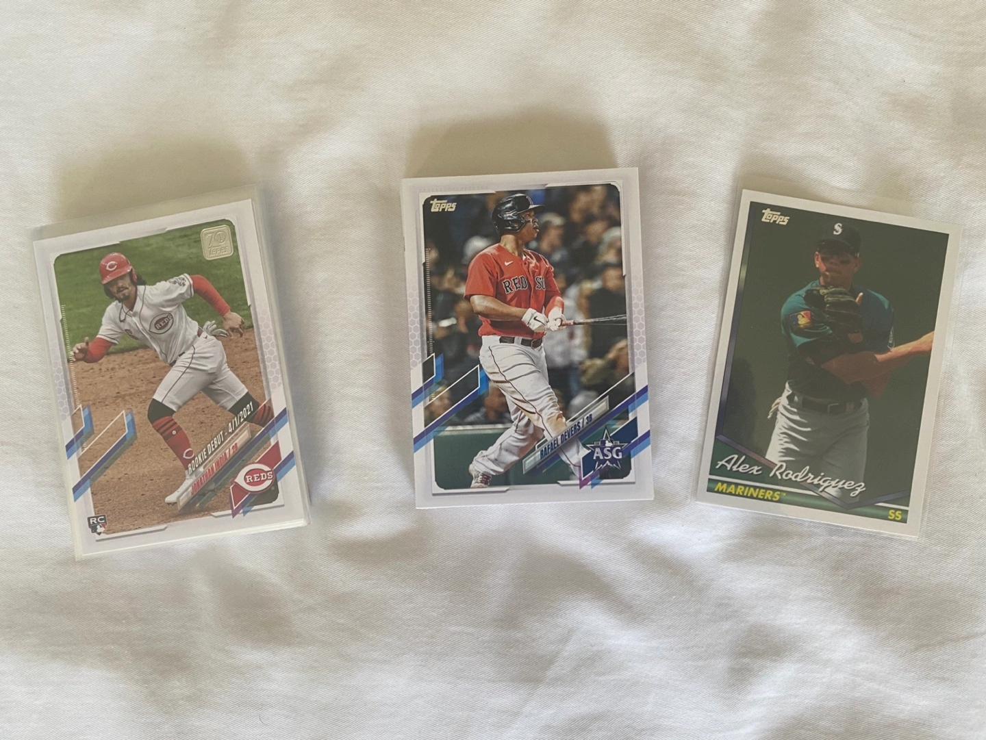 Collection of Topps 2021 baseball cards. Includes a Topps Alex Rodriguez Mariner card, rookie cards and large selection of base cards. Great for collectors or enthusiasts. Cards are in mint condition with all good cards/rookies in sleeves. Around 90 cards in total.