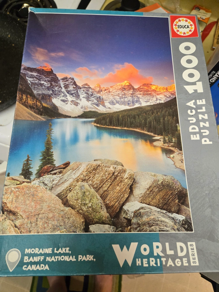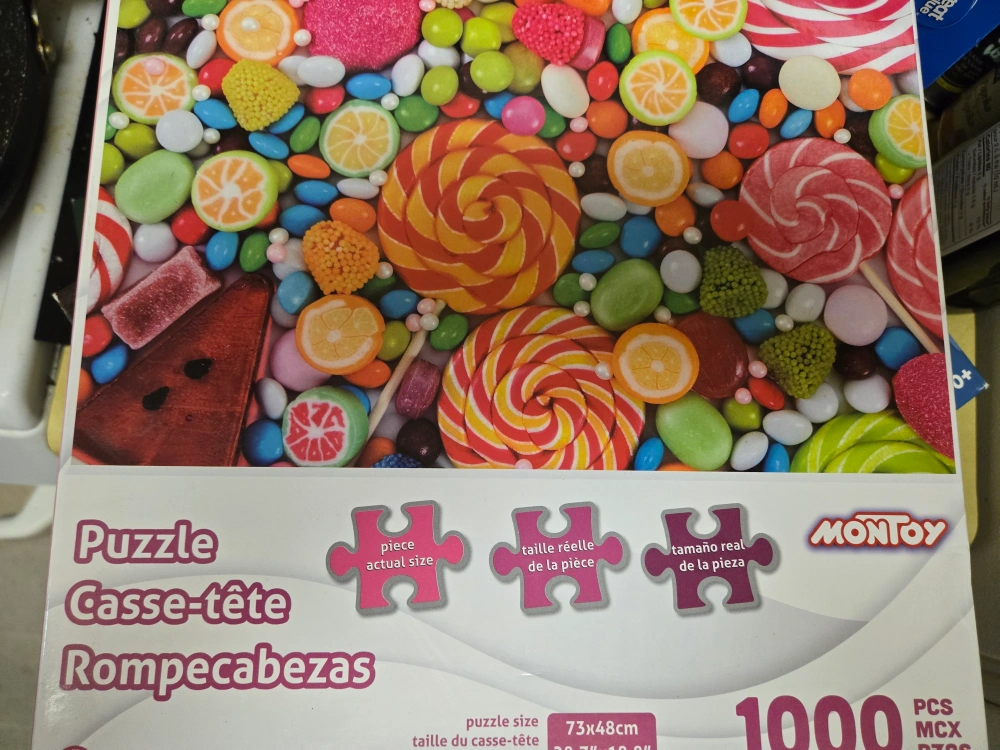Set of there jigsaw puzzles. One Educa 1000 piece puzzle featuring Moraine Lake. One Mega Puzzles 1500 deluxe piece puzzle. One Montoys 1000 piece puzzle of candy. $10 for all 3