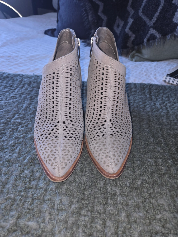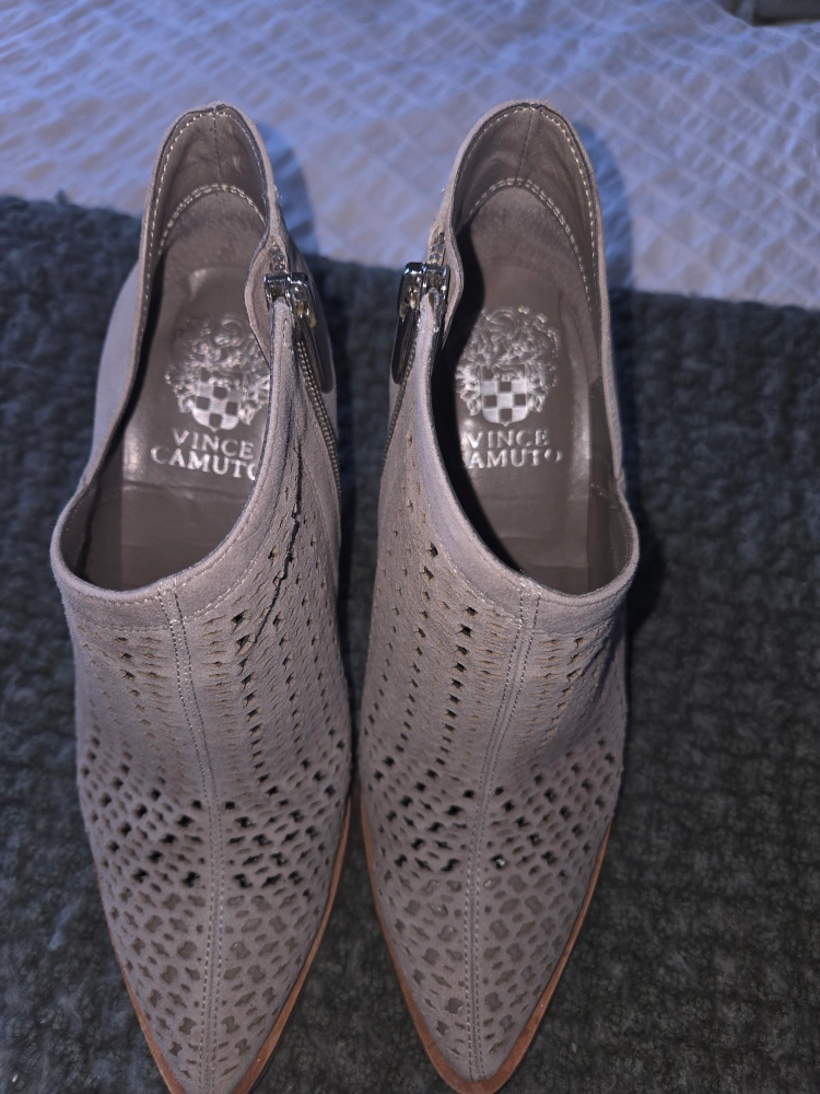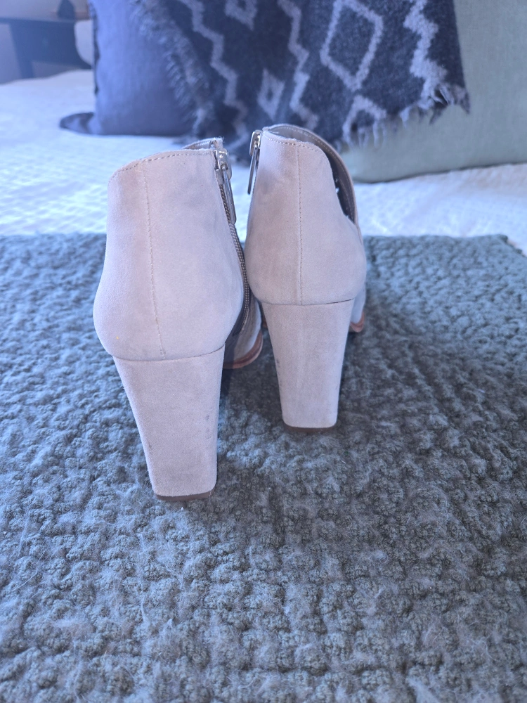 Beautiful grey suede heels. Features cut-out detailing and a block heel. Side zip closure. Pointy toe.