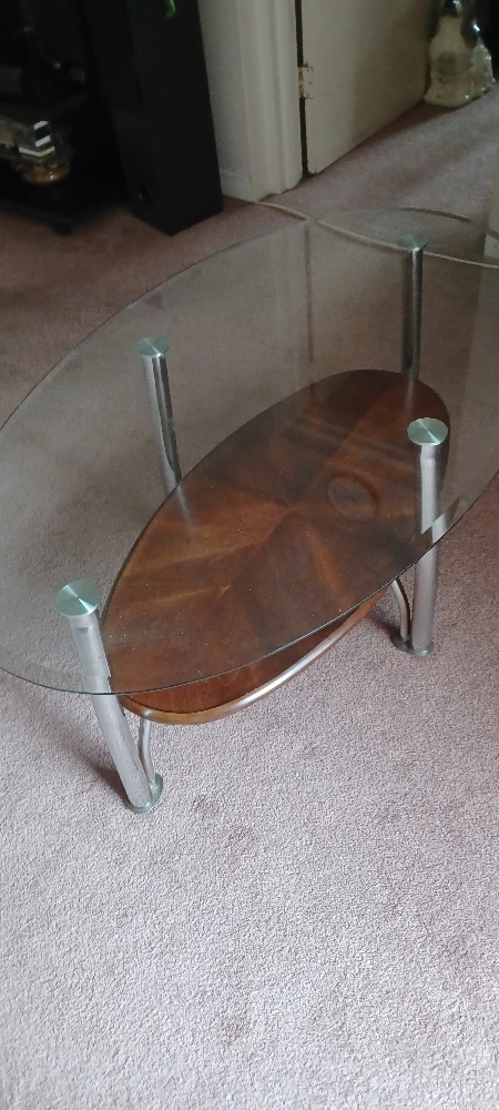 Contemporary coffee table. Features an oval glass top and a dark wood base. Metal legs. Modern design.