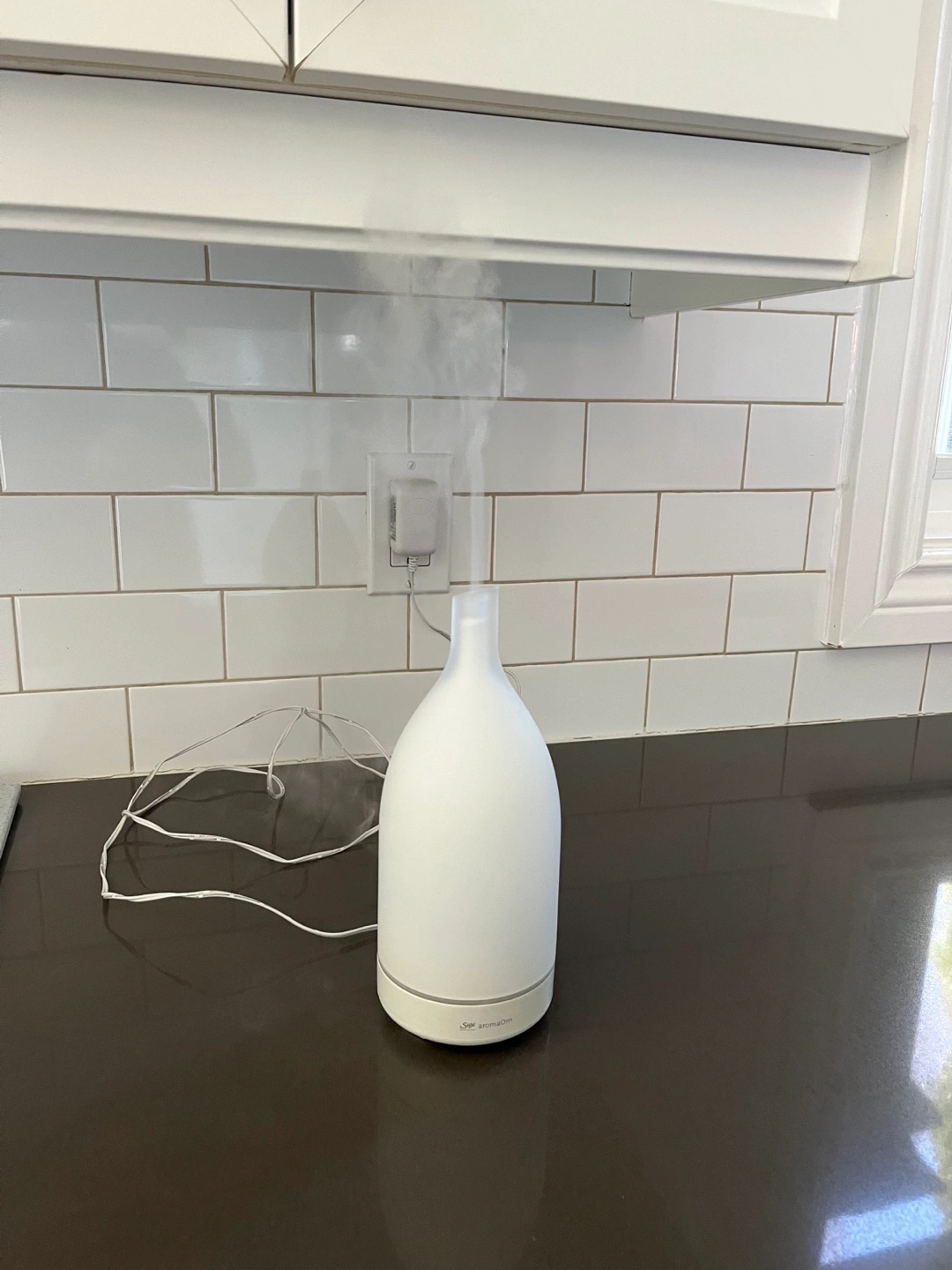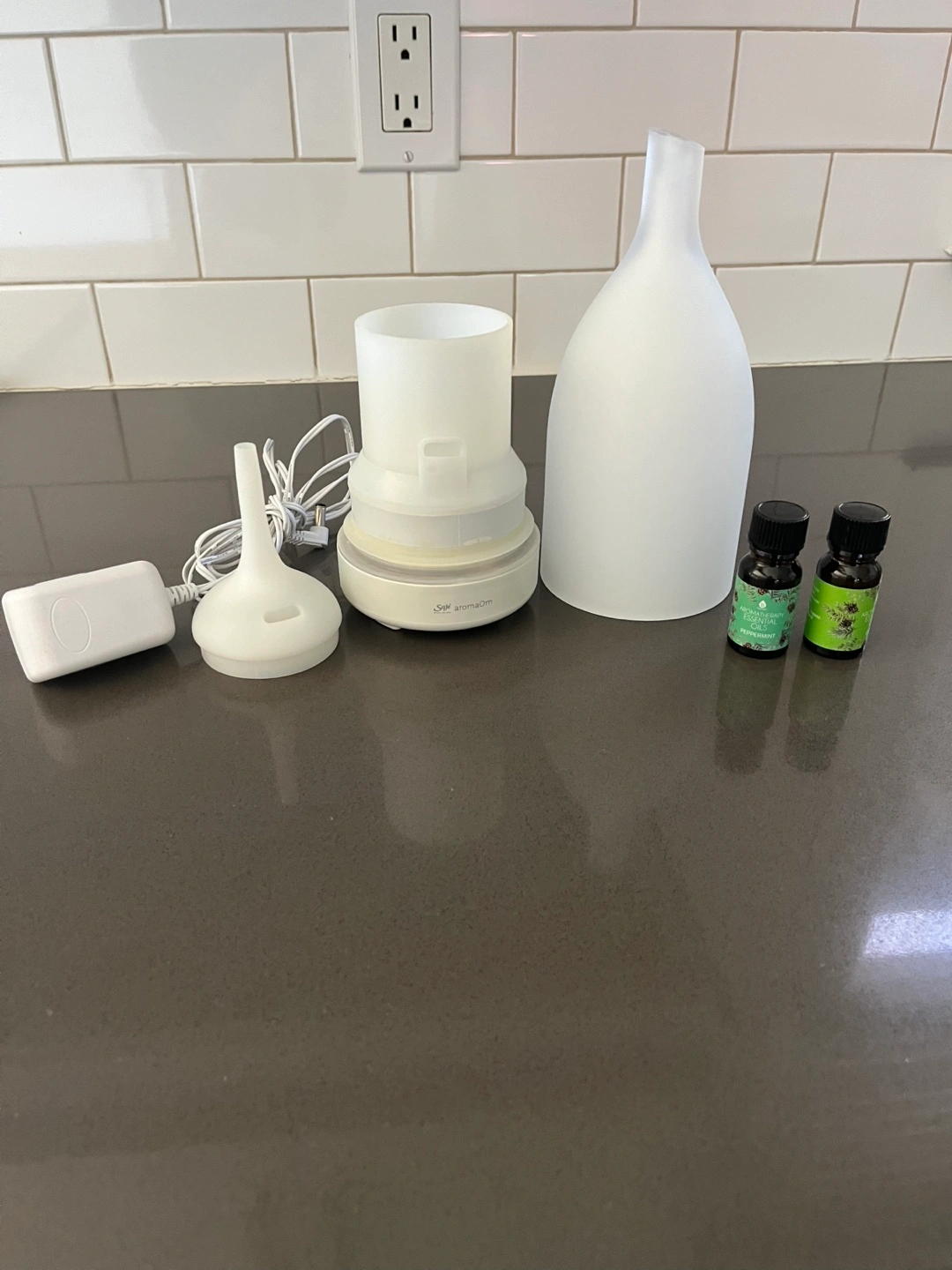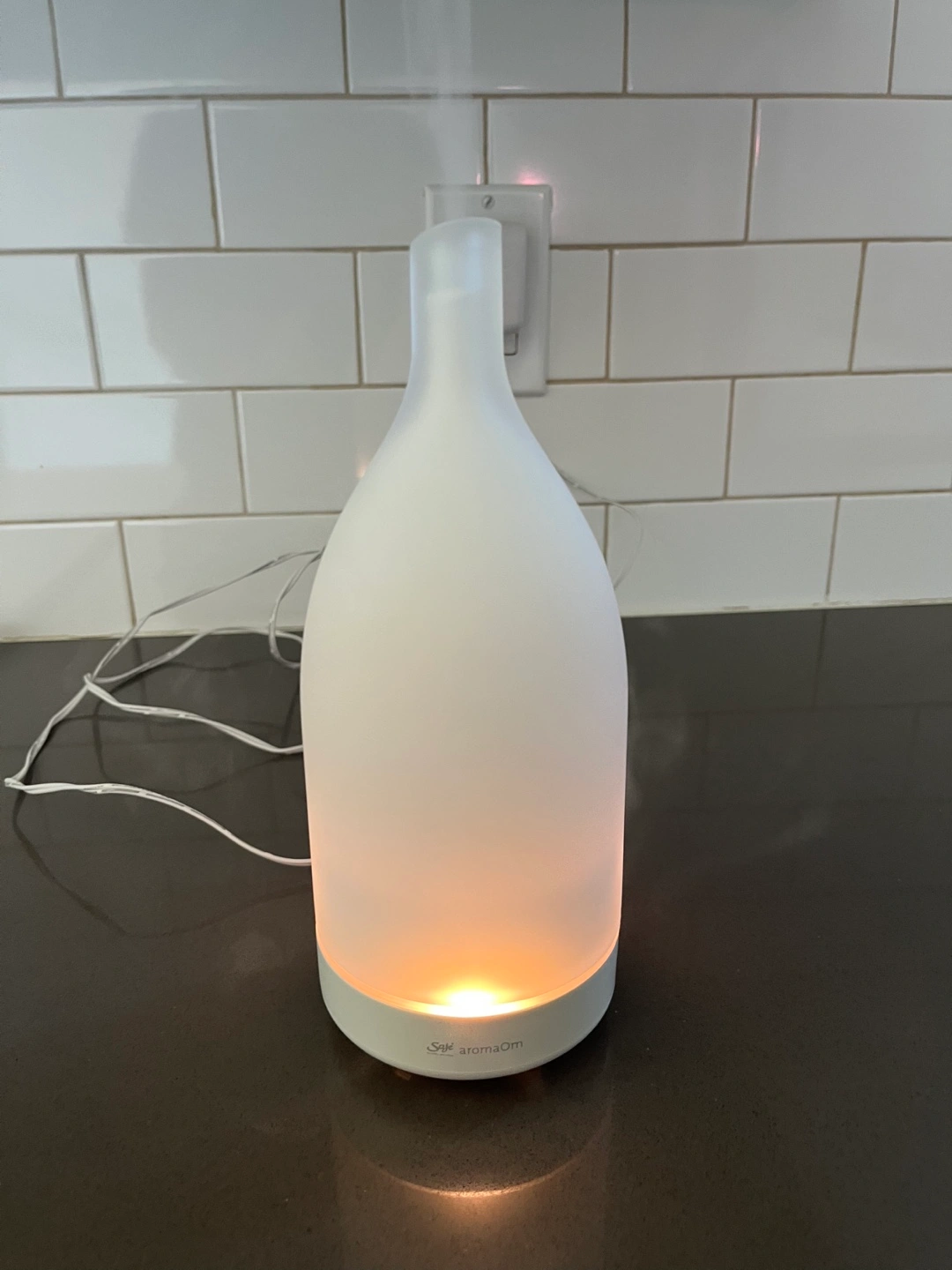 Saje aroma Om diffuser, frosted glass design. Includes two 10ml bottles of essential oils: peppermint and lemon. Ultrasonic technology. Good condition. Pick up in Utopia