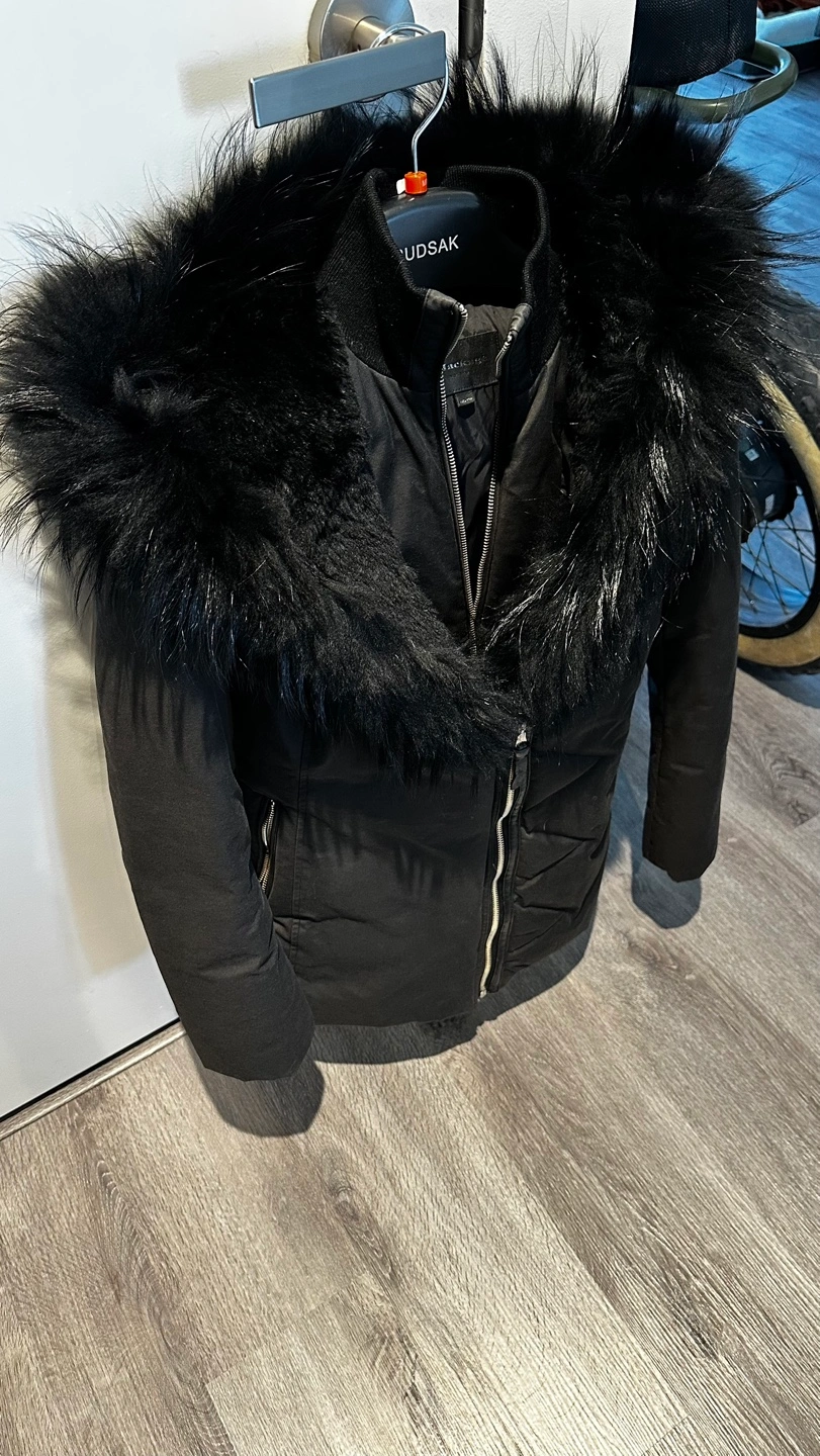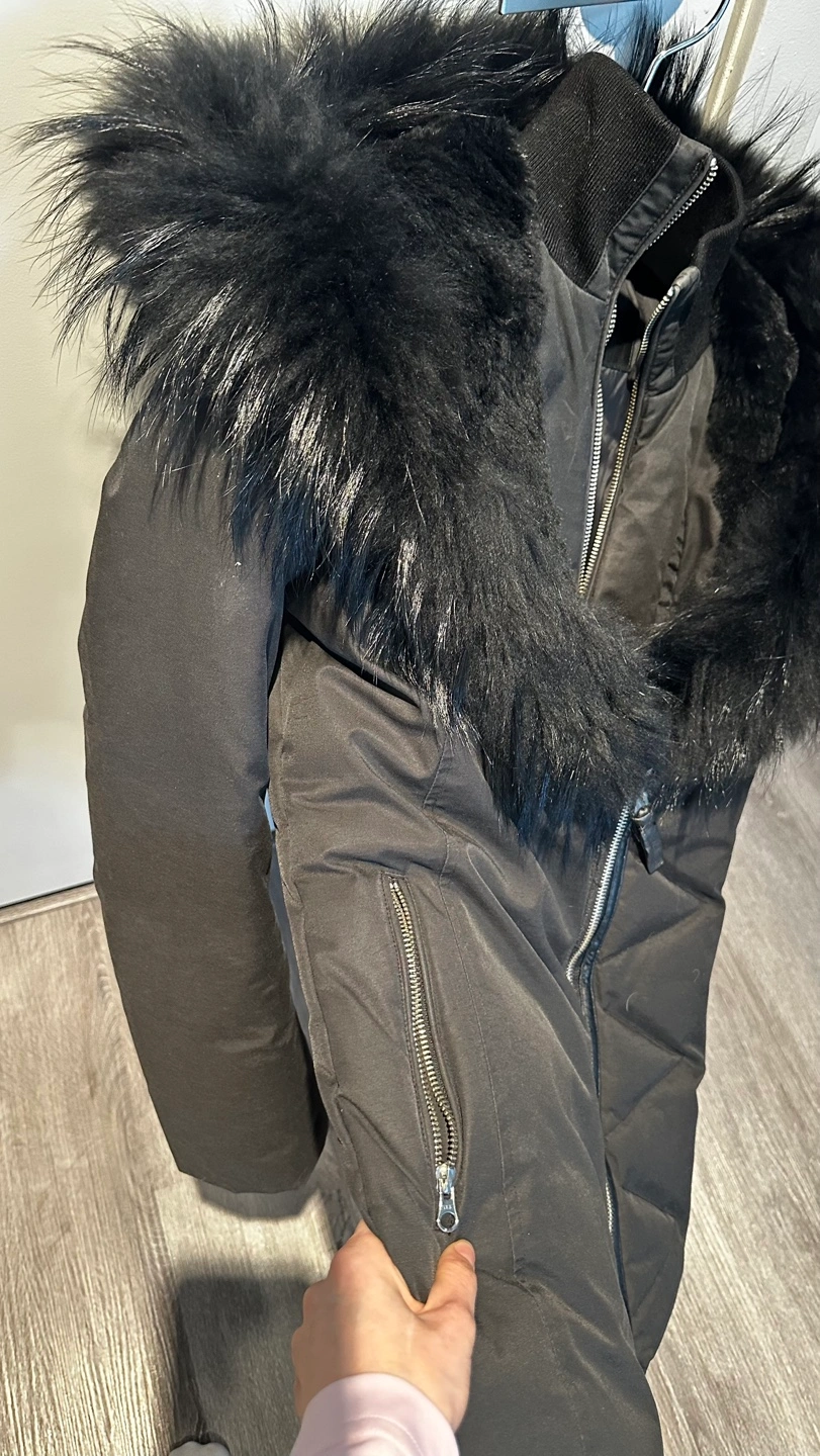 Women's black down-filled jacket. Features a large black fur trim around the hood. Zipper closure. Two zippered pockets. Excellent condition.