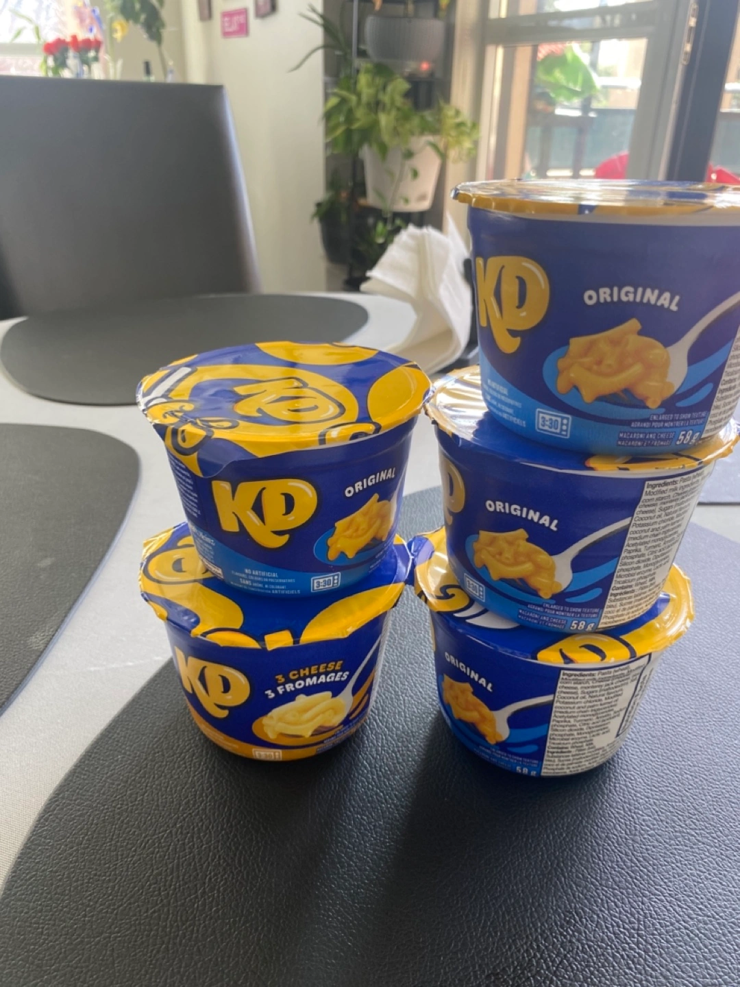 Four Kraft Dinner cups. Two original and two 3 cheese. Individual serving size. Unopened. June and August 2025 expires. Not our taste!
