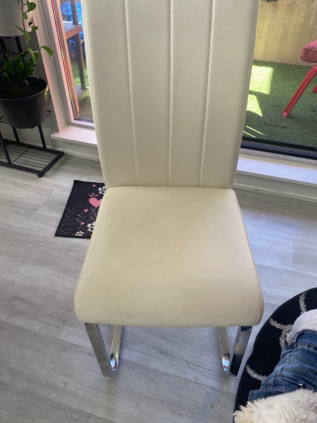 Modern dining chair. Cream coloured PU leather seat and back. Sleek chrome legs. Good condition. Stylish and comfortable. Selling each for $65