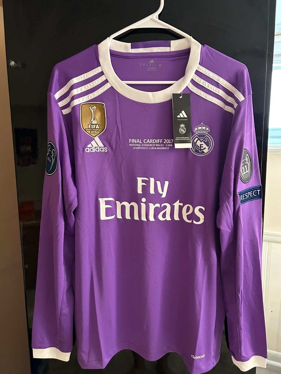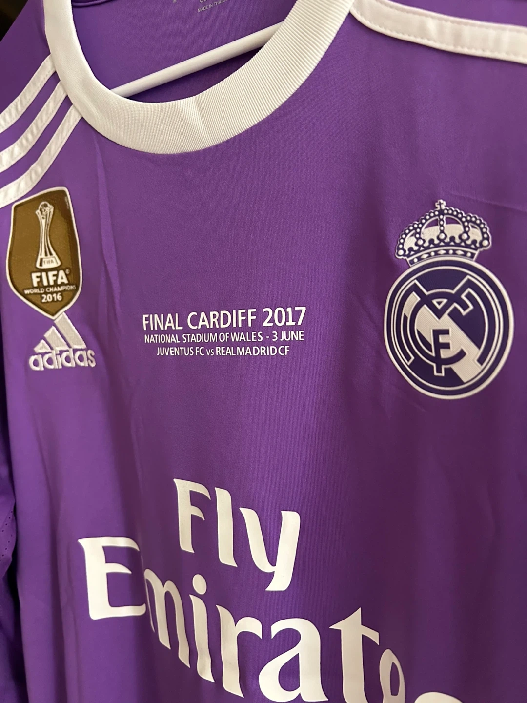 This is a Real Madrid long-sleeved soccer jersey from the 2017 Final Cardiff match. It features Ronaldo's name and number 7 on the back, along with the FIFA World Champions 2016 patch and UEFA Respect patch. The jersey is purple with white trim. It's made with climacool technology for breathability.