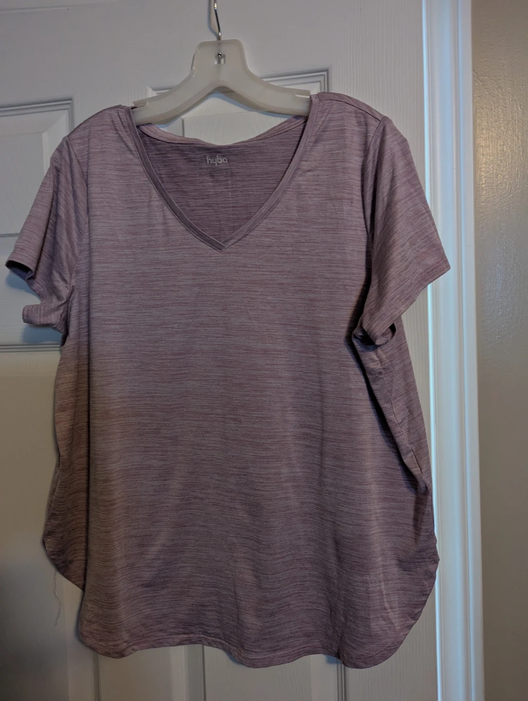 This is a Hyba women's v-neck t-shirt in a heathered mauve colour. It's made from a soft, lightweight fabric. Perfect for active wear or casual outings! Size xl. SFH