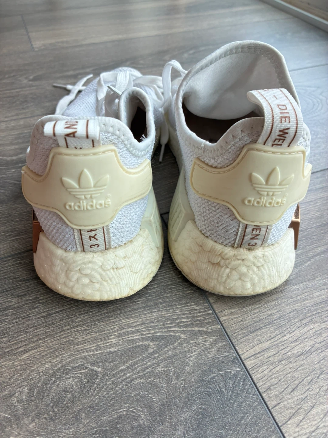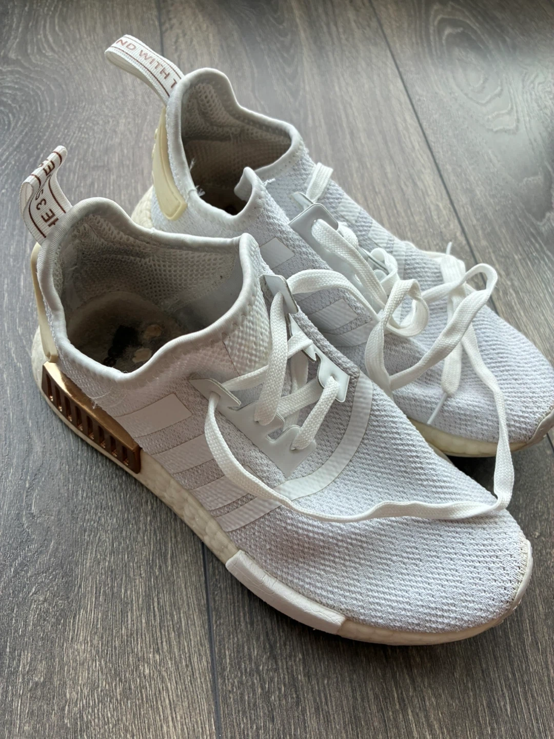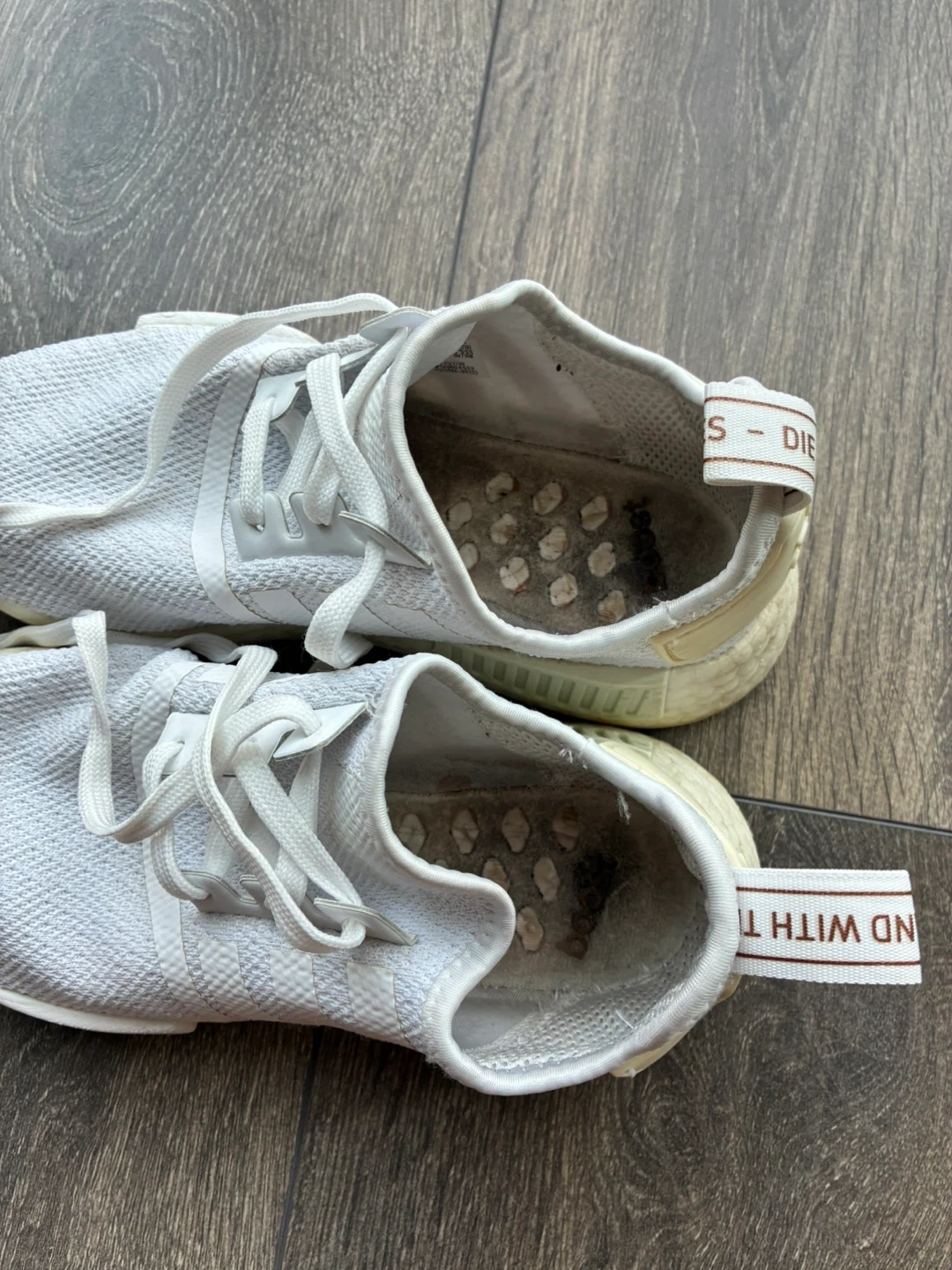Selling a pair of Adidas NMD R1 sneakers in white size women 7. They show signs of wear, as you can see in the photos, but still have plenty of life left. You’ll have to use an insert inside.
