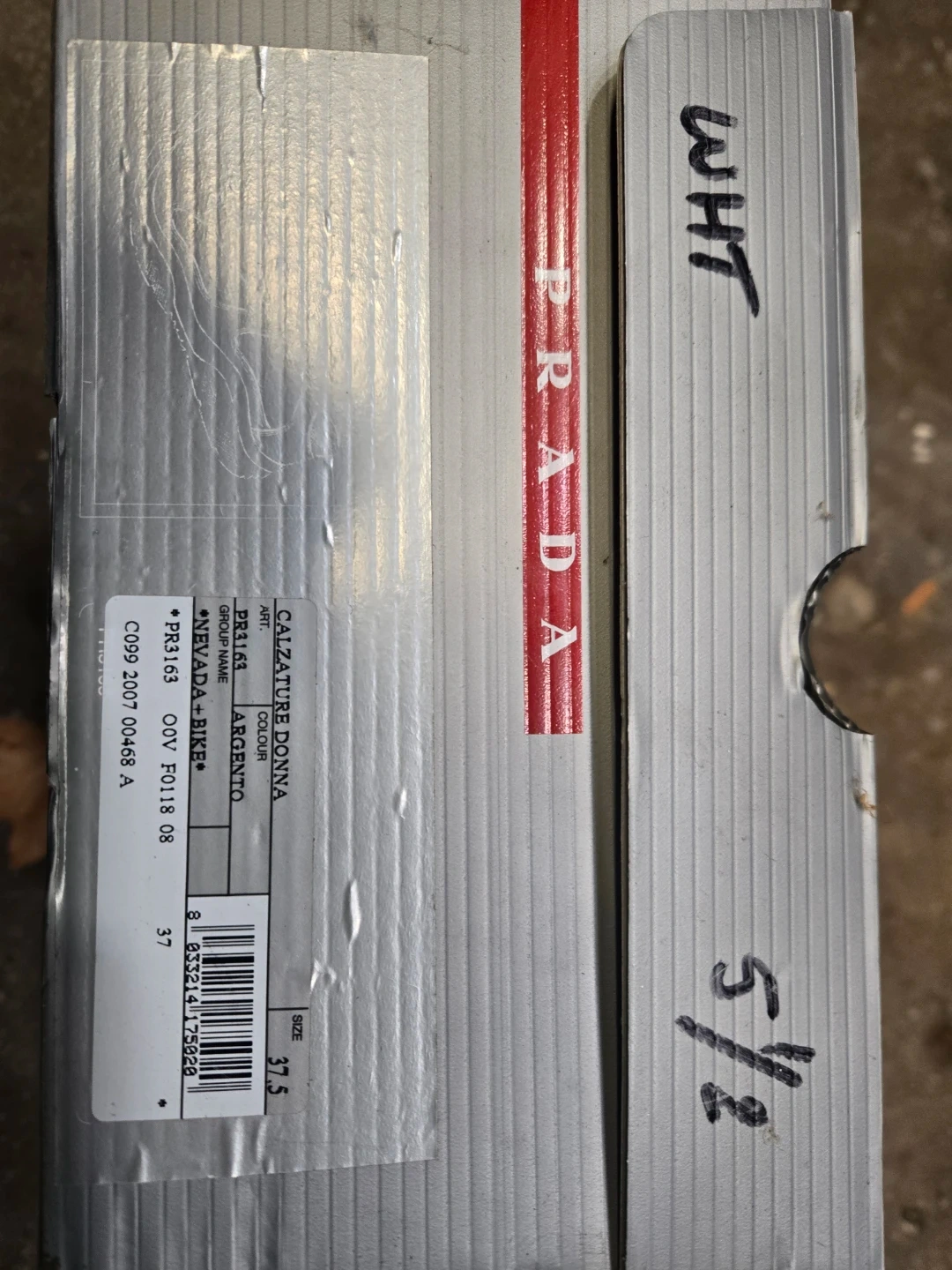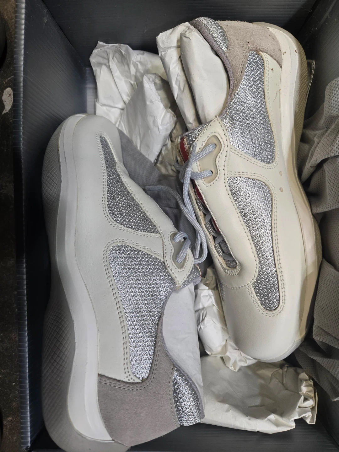 Selling a pair of Prada Nevada Bike sneakers in white and silver. The size is US 5.5 / EU 37.5. They come with the original box