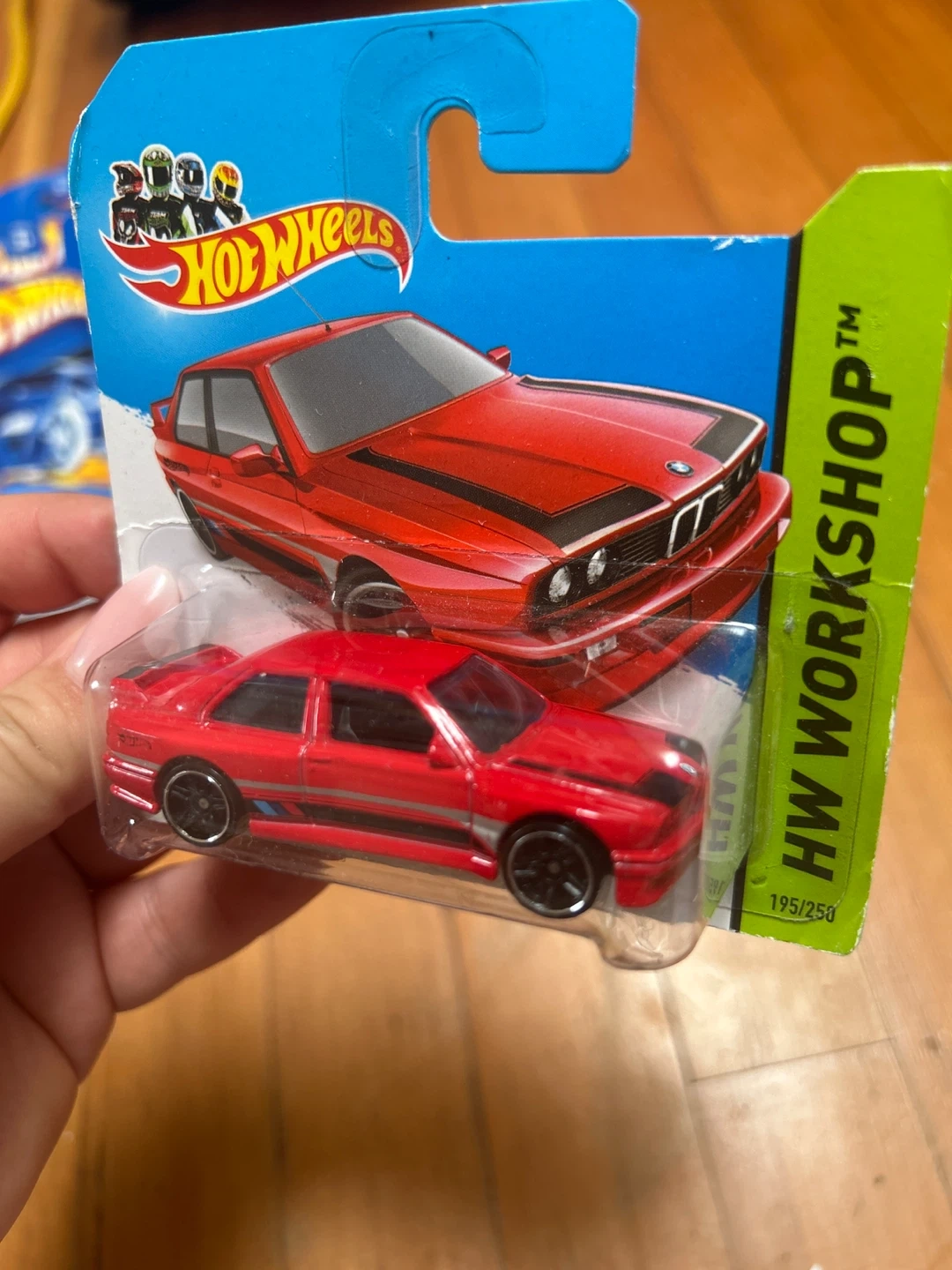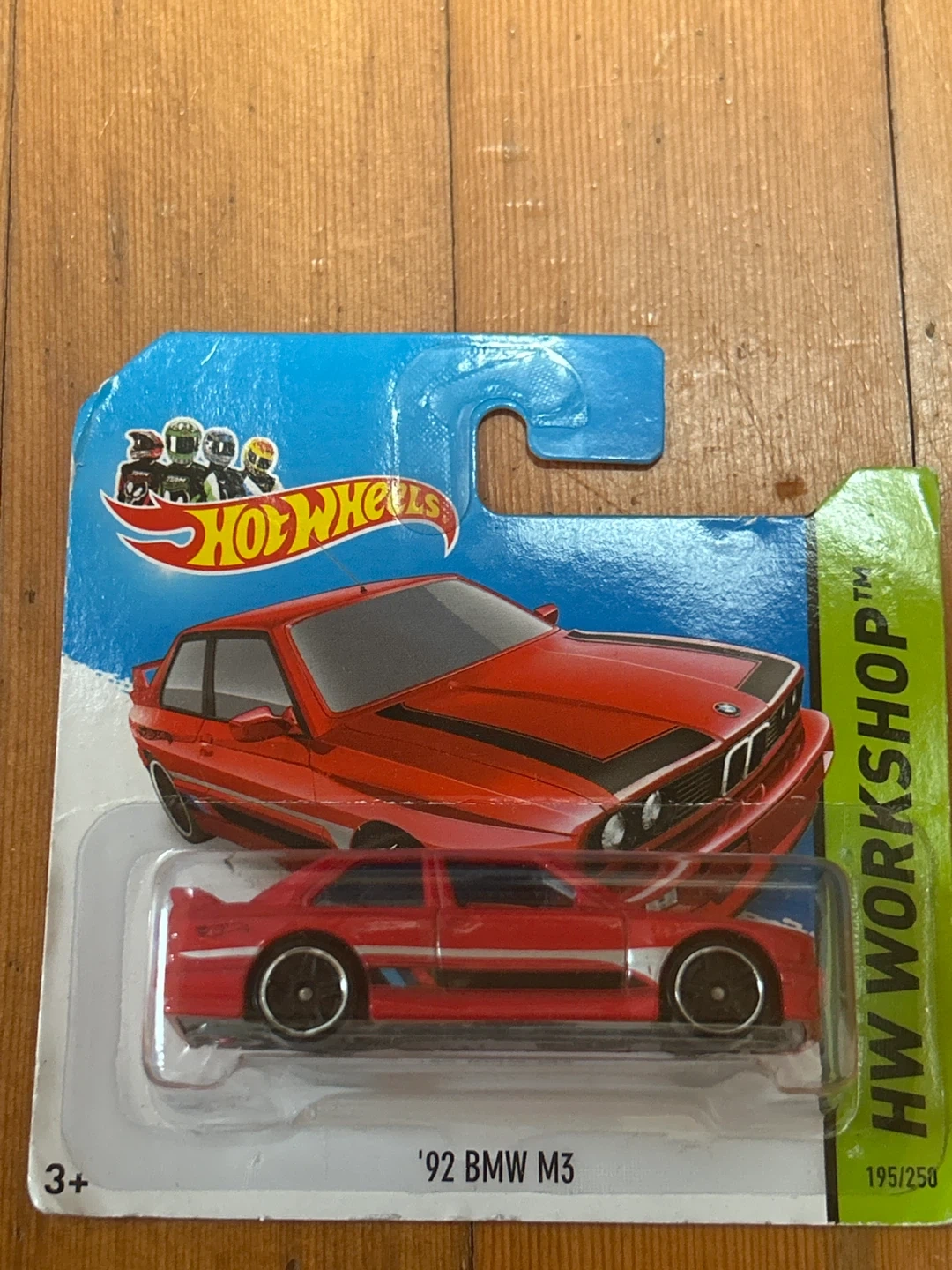 Hot Wheels ’92 BMW M3 in red, still sealed in original packaging.