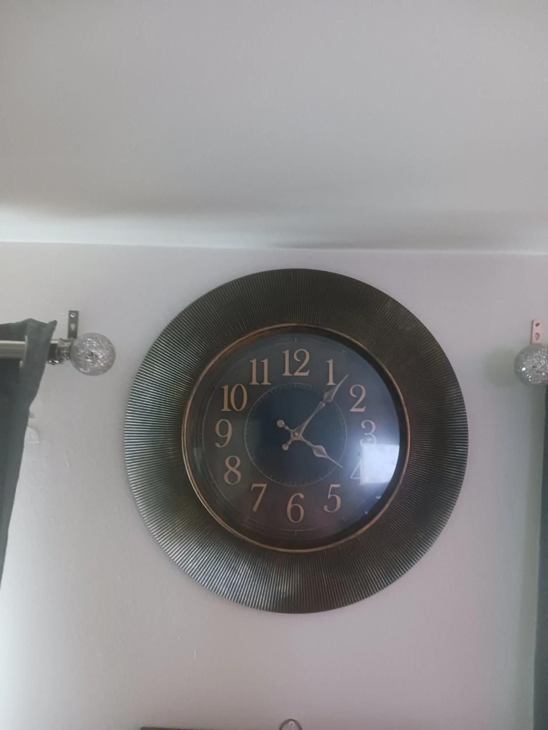 This is a stylish decorative wall clock. It features a dark face with gold-toned numbers and hands. The outer frame has a ribbed texture. It's a great addition to any room!